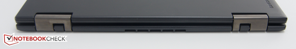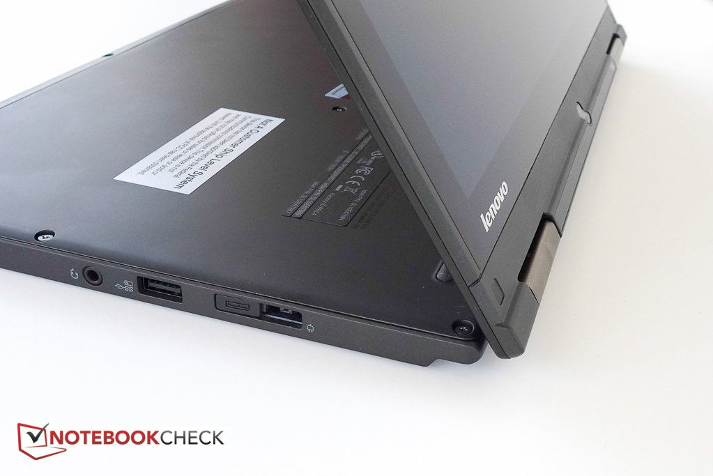 Da die Scharniere einen Großteil der Rückseite einnehmen, und die Vorder- sowie Rückseite im Tent-Modus nicht erreichbar sind, hat Lenovo die Anschlüsse auf die rechte und linke Seite des Gehäuses verteilt. Die Anordnung der Anschlüsse verdient unser Lob, denn sie beginnt erst auf Höhe der Tastatur und verhindert damit Kabelsalat bei der Verwendung einer Maus. Es gibt jeweils einen USB-3.0-Anschluss auf beiden Seiten (der rechte Anschluss unterstützt das Aufladen von Geräten im abgeschalteten Zustand), weshalb sich zwei größere Geräte nicht gegenseitig behindern können.