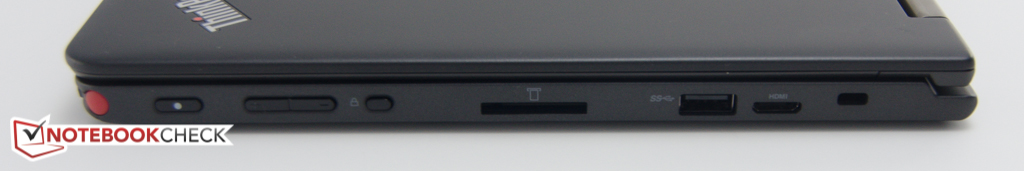 Da man das Yoga ebenso als Tablet benutzen kann, wurden der Power-Button, die Lautstärkewippe und die Rotationssperre für das Display auf der rechten Seite des Gehäuses platziert, um die Bedienbarkeit zu verbessern. Der bekannte Windows Home-Button befindet sich unterhalb des Bildschirms, und ganz vorne rechts ist der Einschub für den Digitizer. Auf einen Ethernet-Anschluss und einen VGA-Ausgang muss im Gegensatz zu einigen anderen Ultrabooks (normalerweise via Dongle) allerdings verzichtet werden, es gibt lediglich einen Mini-HDMI-Anschluss für die Videoausgabe. Die eingebaute 720p-Webcam reicht für Videokonferenzen aus, sie hat allerdings Probleme mit Bildrauschen bei schlechten Lichtverhältnissen.