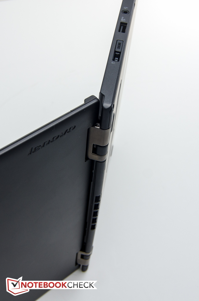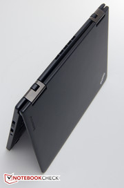 Das Yoga ist zudem sehr stabil: Der Tastaturbereich sowie die Handballenauflage können nur minimal eingedrückt werden, und ein Versuch, die Basiseinheit zu verwinden, bleibt ohne Erfolg. Das Display, das mit einer dicken Schicht des kratzfesten Corning-Gorilla-Glas überzogen wurde, ist nicht ganz so verwindungssteif, aber auch hier konnten wir keine sichtbaren Auswirkungen auf dem Bildschirm hervorrufen. Die Scharniere bestehen aus einer Zinklegierung und sind ausreichend groß und straff, um den Bildschirm unter jedem Winkel zu halten. Ein leichtes Nachwippen können sie aber nicht verhindern.