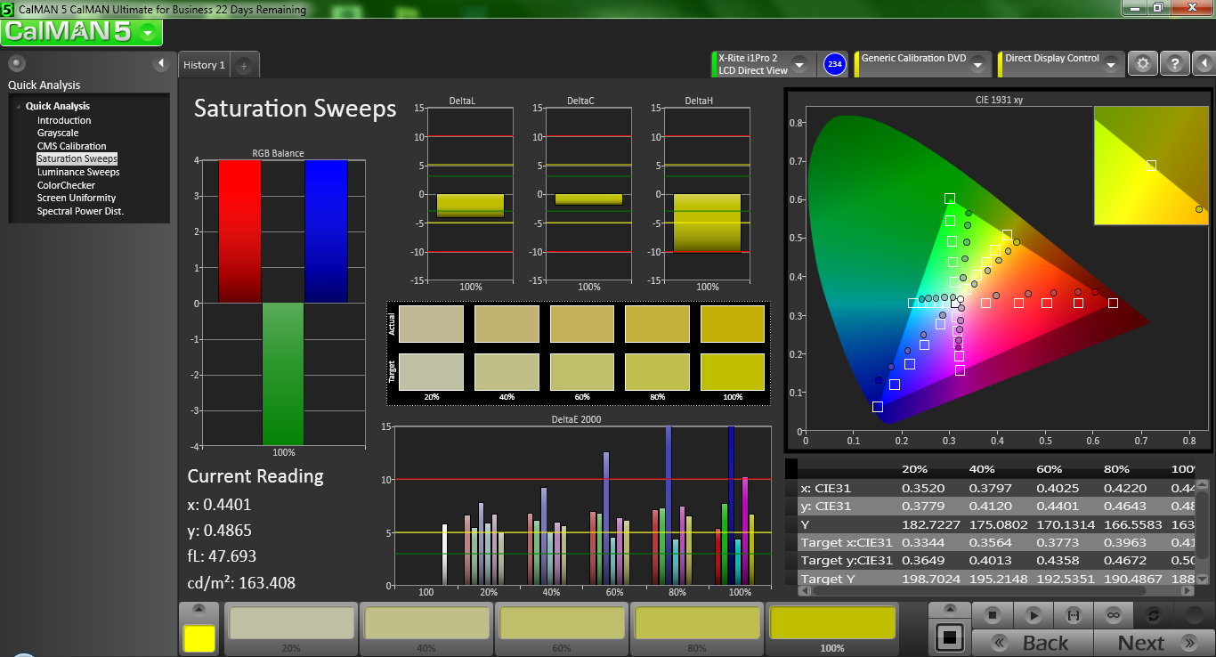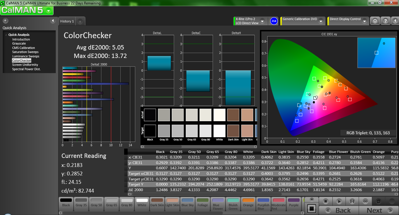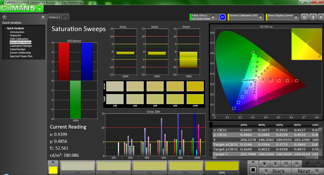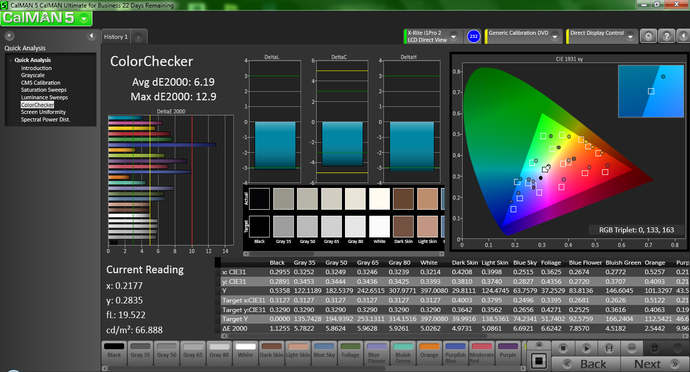 Im Auslieferungszustand weist das Display eine durchschnittliche DeltaE-Abweichung von 6 auf, wobei das Maximum von 13 bei Blau auftritt. Der Gammawert liegt bei 2,71 (ideal 2,2) und die Farbtemperatur bei 5.830 K (ideal 6.500 K). Eine Kalibrierung verbessert die Abweichung bei den Farben mit 5 und 13 (erneut bei Blau) nicht allzu sehr, dafür liegen aber sowohl der Gammawert als auch die Farbtemperatur deutlich näher am Idealwert (2,35/6.100 K).
