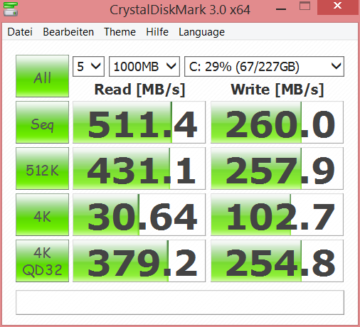 Während der System Storage des PCMark 7 nur 4 % Vorsprung für die 256er SSD ausgibt, bevorteilen die Speicher-Benchmarks CrystalDiskMark und ASSSD die Samsung 840 (MZ7TD256HAFV-000L9, 2,5 Zoll SATA) deutlicher. Die deutlich besseren Write-Werte (+10 bis 92 %) sorgen in Summe für ein Leistungsplus von 29 %.