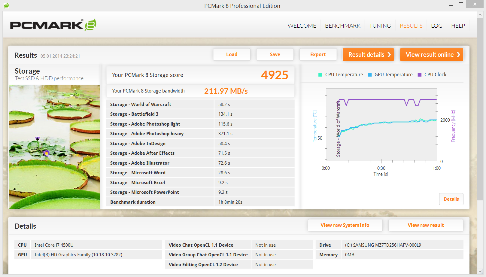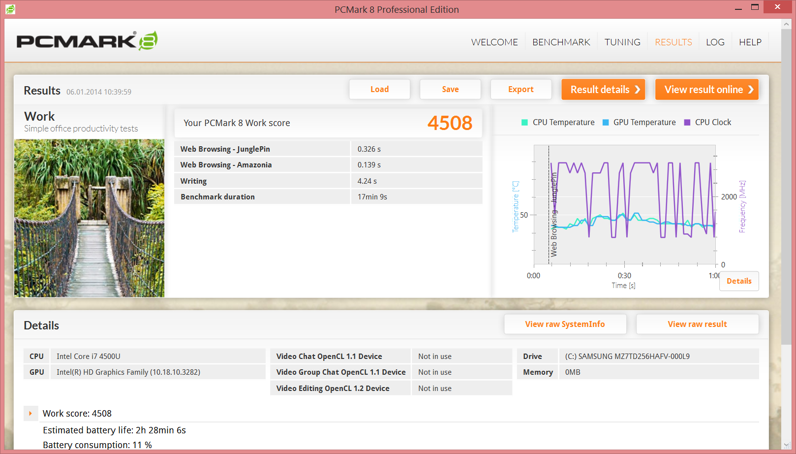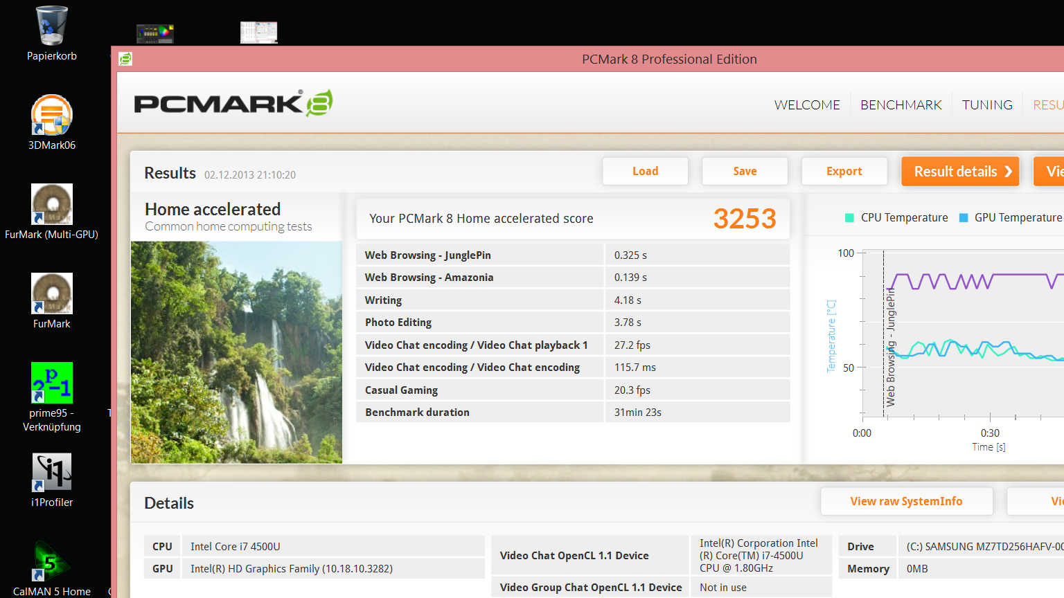 Die PCMark-7-Werte bescheinigen dem i7-4500U-Modell mit der 256er-Samsung-SSD eine etwas höhere Systemleistung (9%). Am größten fällt der Unterschied im Computation-Sub-Score aus (12 %), der scheinbar den Cinebench-Ergebnissen nacheifert.