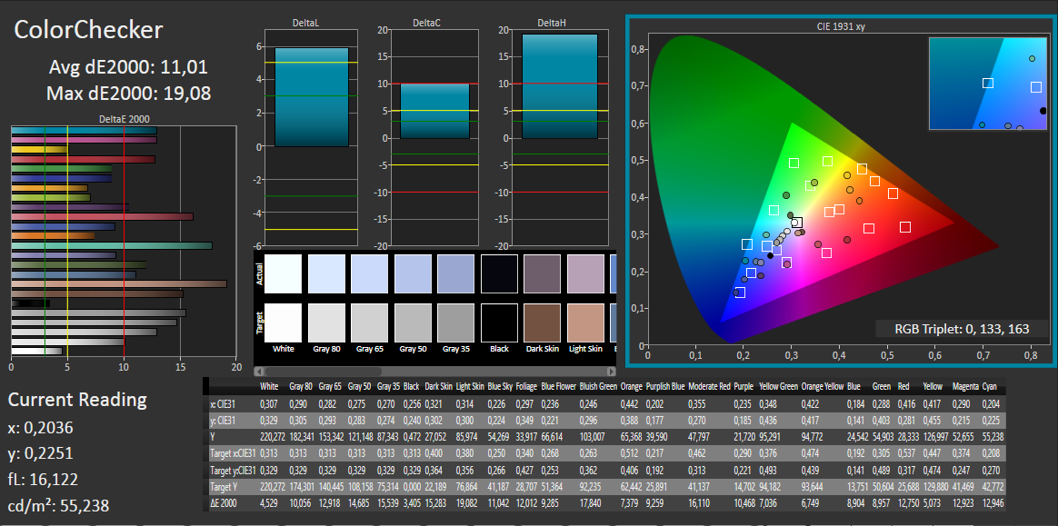 Im Auslieferungszustand zeigt der Bildschirm eine DeltaE-2000-Abweichung von 11,01. Das ist ein normaler Wert im Preissegment des Thinkpad. Das Ziel wäre ein Wert kleiner 3. Das Display weist einen Blaustich auf.