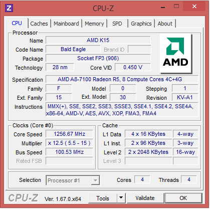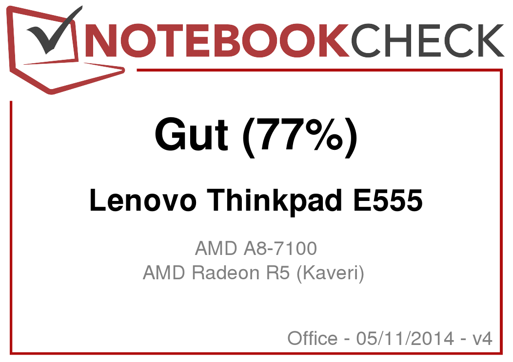 Lenovo hat das Thinkpad E555 mit einer A8-7100 APU von AMD ausgestattet. Sie entstammt der Kaveri-APU-Generation. Bei dem CPU-Teil der APU handelt es sich um einen Vierkernprozessor, der mit einer Basisgeschwindigkeit von 1,8 GHz arbeitet. Mittels Turbo kann die Geschwindigkeit auf bis zu 3 GHz erhöht werden. AMD beziffert die TDP mit 19 Watt. Damit liegt diese etwas oberhalb derjenigen von Intels Haswell-ULV-Prozessoren (15 Watt).
