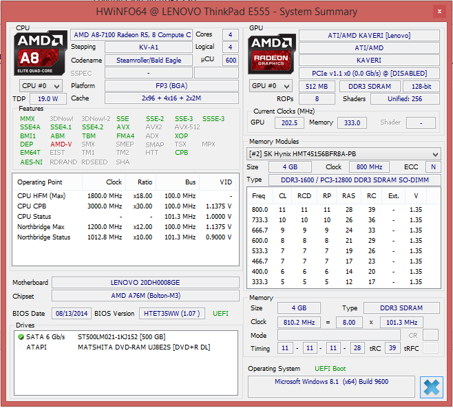 | Lenovo Thinkpad E555 Radeon R5 (Kaveri), A8-7100, Seagate ST500LM021-1KJ15 | Lenovo ThinkPad Edge E545-20B2000PGE Radeon HD 8650G + HD 8570M Dual Graphics, A10-5750M, WDC Scorpio Blue WD10JPVX-22JC3T0 | Fujitsu LifeBook A544 HD Graphics 4600, 4200M, Hitachi Travelstar Z5K500 HTS545050A7E680 | Acer TravelMate P255-M-54204G50Mnss HD Graphics 4400, 4200U, Seagate Momentus Thin ST500LT0 12-9WS142 | |