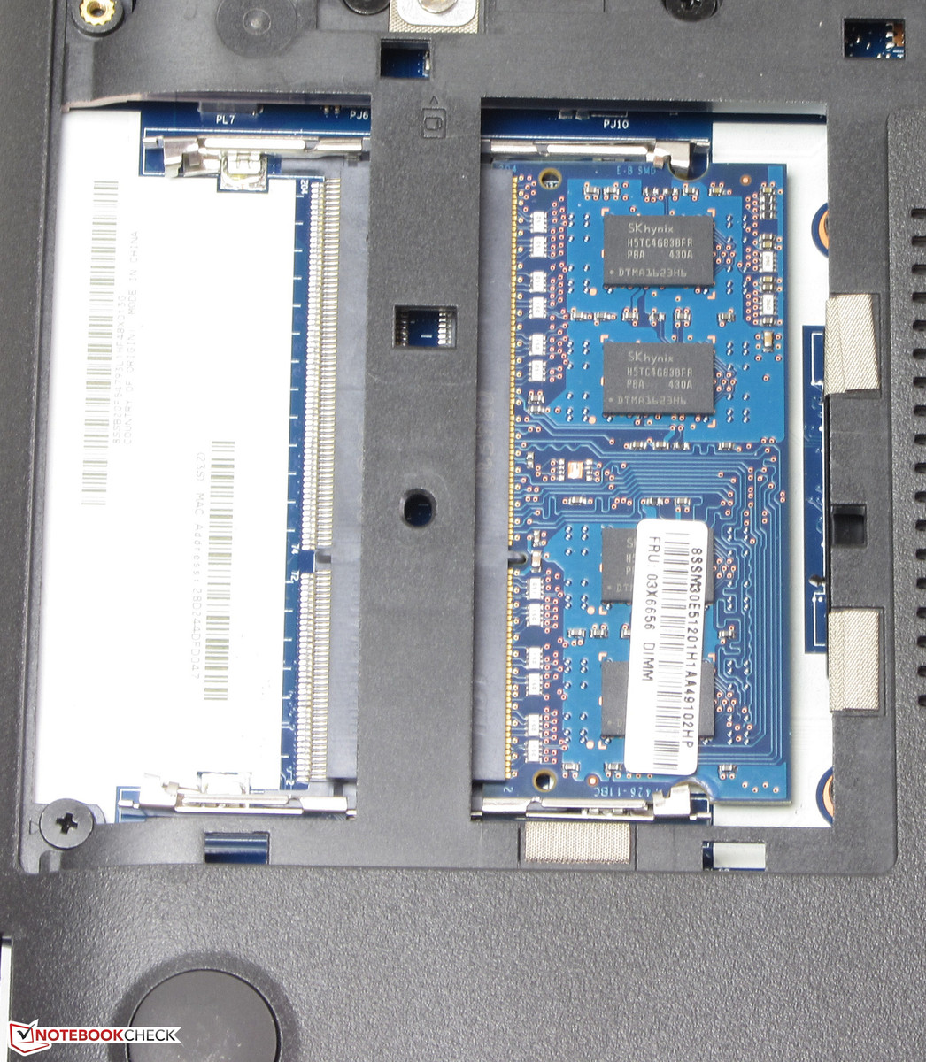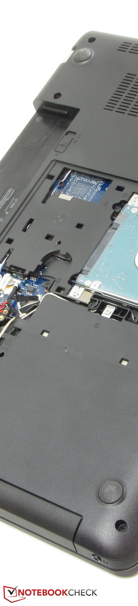 Das Thinkpad verfügt über ein großes Wartungsfach, das den Zugriff auf die Festplatte, den Arbeitsspeicher, das WLAN-Modul und die BIOS-Batterie erlaubt. Das Notebook ist mit zwei Arbeitsspeicherbänken bestückt, von denen lediglich eine Bank belegt ist. Ein Tausch der Festplatte wäre möglich. Es können aber nur 2,5-Zoll-Festplatten mit einer Bauhöhe von 7 mm benutzt werden. Auch die BIOS-Batterie sind bei Bedarf auswechselbar. Bei den Vorgängermodellen des E555 kann auch auf den Lüfter zugegriffen werden. Das ist beim E555 nicht mehr möglich.