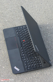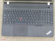 Auch die neueste Inkarnation des Thinkpad E ist mit einem Trackpoint und einem Clickpad ausgestattet. Allerdings besteht ein kleiner Unterschied gegenüber den Vorgängermodellen: Die separaten Maustasten des Trackpoints sind verschwunden. Stattdessen stellt nun der obere Rand des Clickpads diese Tasten dar. Das multitouchfähige Clickpad belegt in etwa eine Fläche von 10 x 7,5 cm. Die glatte Oberfläche des Pads behindert die Finger nicht beim Gleiten. Auch die Nutzung der Gestensteuerung funktioniert problemlos. Das Pad besitzt einen kurzen Hub und einen deutlichen Druckpunkt. Der Trackpoint arbeitet völlig problemlos und erlaubt eine präzise Steuerung des Mauszeigers. Schon nach kurzer Zeit möchte man ihn nicht mehr missen.