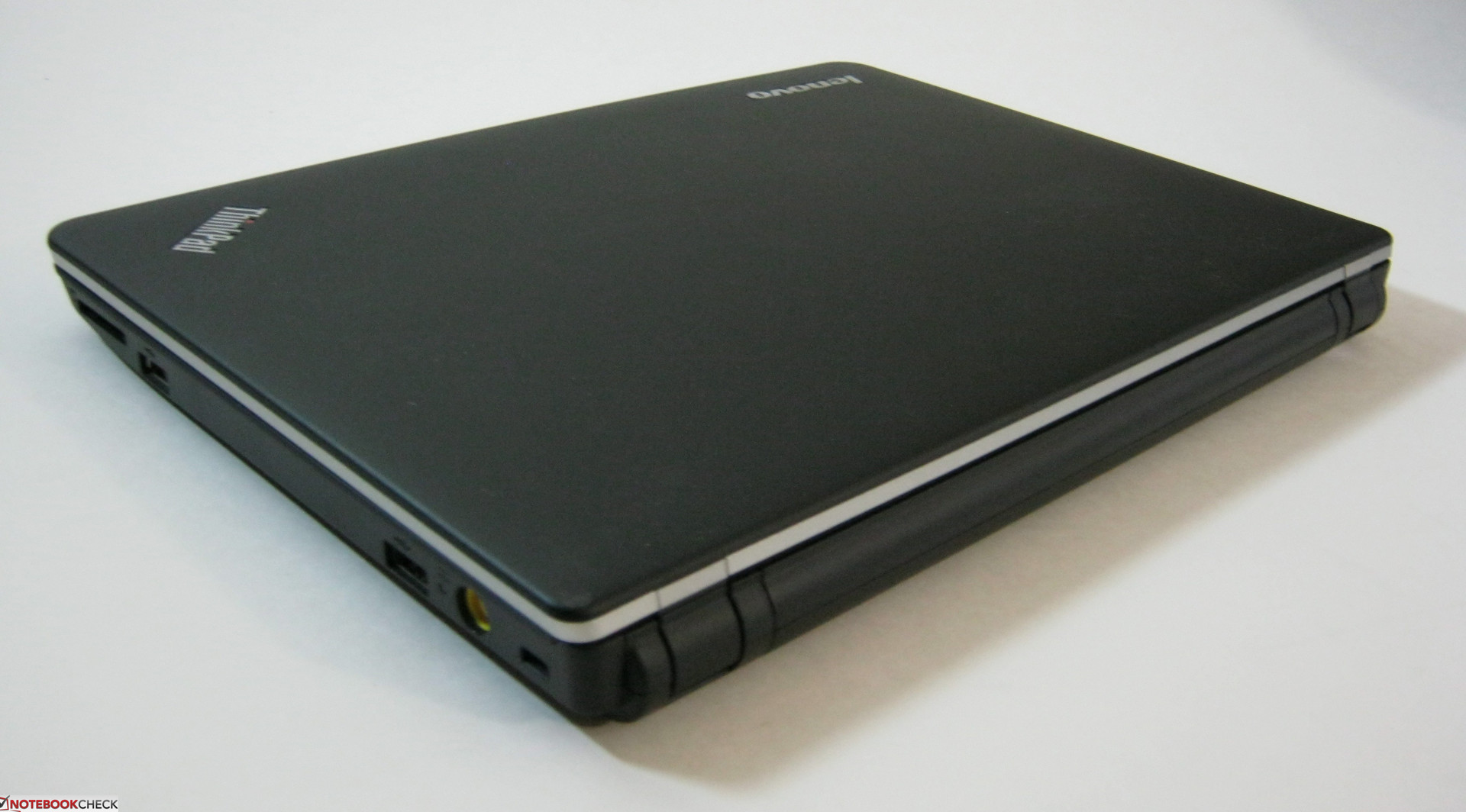 Die Edge Serie von Lenovo ist eine vergleichsweise junge Serie der Thinkpad Familie und ist auch in Anbetracht ihrer Business Ausrichtung relativ elegant. Das 11.6-zöllige Edge E125 fällt diesbezüglich nicht aus der Reihe. Es misst 2.2cm (0.86 Zoll) an der höchsten Stelle und hält an der insgesamt matten Ausführung mit weicher und samtener Haptik fest. Im besonderen fühlt sich der Bildschirmdeckel weich an, bietet aber dennoch genügend Festigkeit, um bei Fingerdruck nicht nachzugeben. Überraschenderweise, ist der Bildschirmdeckel dennoch kein Magnet für Fingerabdrücke und Verschmutzungen lassen sich einfach abwischen. Das edle Aussehen hat das Notebook hauptsächlich dem grauen Beschlag um seinen Bildschirmdeckel zu verdanken. Ansonsten ist das Notebook rabenschwarz, und Farbe ist einzig den chromefarbigen Lenovo und Thinkpad Logos vorbehalten. Wie andere Notebooks der Edge Serie, muss auch das Edge E125 auf das charakteristische Thinkpad Gerippe verzichten. Dennoch erweist es sich in Anbetracht des kleinen Formfaktors als ziemlich verwindungsresistent. Anscheinend verleiht der Rahmen dem Laptop rundherum eine überdurchschnittliche Druck- und Verwindungsfestigkeit.