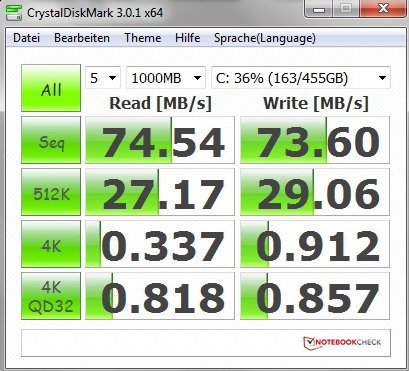 Als Speichermedium werkelt in unserem Testgerät eine 2,5-Zoll-Festplatte von Hitachi mit einer Bruttokapazität von 500 GByte. Die Travelstar 5K500 alias HTS545050B9A300 gehört zum Mainstream-Programm des Herstellers und ist mit maximal 75 MB/s bei einer Leseoperation nicht als schnell zu bezeichnen. Nicht zuletzt die Anbindung via SATA II bei SATA-III-Unterstützung, die Arbeitsgeschwindigkeit von 5400 U/Min sowie die Zugriffszeiten tragen ihren Teil dazu bei. Der Austausch gegen ein moderneres und vor allem schnelleres SSD ist schnell erledigt. Mögliche Kandidaten wären Intel SSD Serie 510 oder die OCZ Agility 3 beziehungsweise Vertex 3.