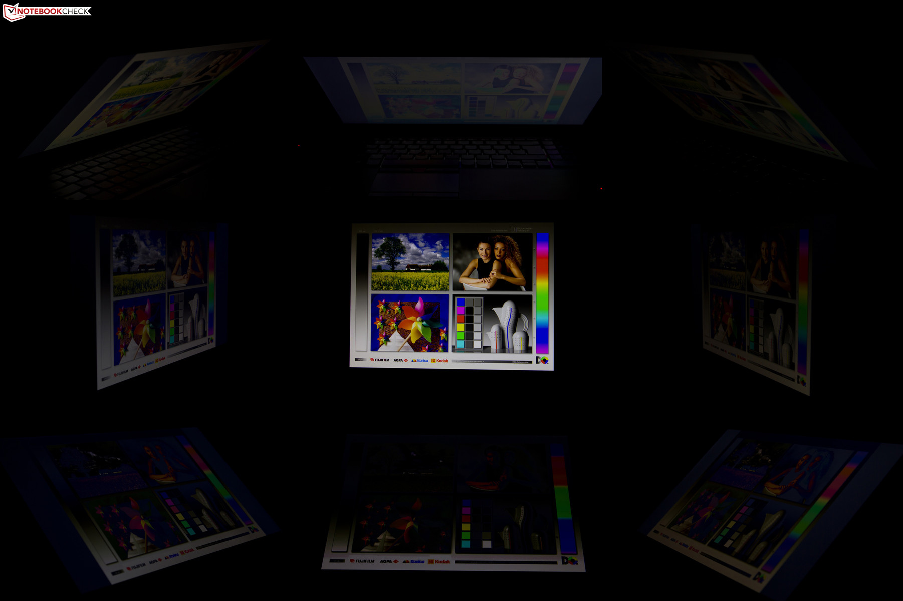 Die Blickwinkelstabilität des Bildschirms entspricht einem günstigen TN-Panel. Die horizontale Wiedergabe ist auch in flachen Winkeln, bis zirka 140 Grad, stabil, und nur ein Verlust der Helligkeit fällt auf. In der Vertikalen kommen zu der abnehmenden Luminanz noch das rasche Invertieren beziehungsweise Aufblenden des Referenzbildes.