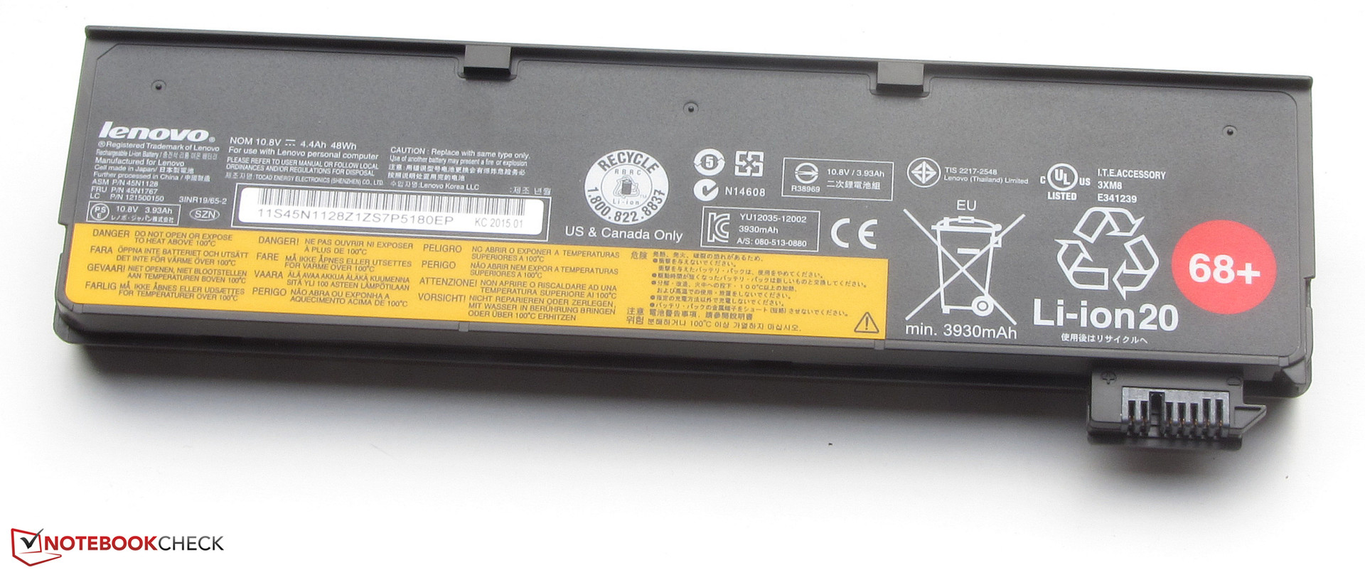Im Idle-Modus erreicht das Thinkpad eine Laufzeit von 13:18 h. Das Dell Latitude 14 E5450 (13:14 h) und das Fujitsu Lifebook E544 (12:51 h) liegen gleichauf. Der Idle-Modus wird durch den Battery Eater Reader's Test überprüft: Der Bildschirm läuft auf der geringsten Helligkeitsstufe, das Energiesparprofil ist aktiviert, und die Funkmodule sind abgeschaltet. Unter Last stellt das Thinkpad den Betrieb nach 1:37 h ein. Erneut zieht das Lifebook (1:35 h) gleich. Das Latitude (2:12 h) hält länger durch. Die Laufzeit unter Last wird mit dem Battery Eater Classic Test ermittelt: Dabei läuft der Bildschirm mit voller Helligkeit, das Hochleistungsprofil und die Funkmodule sind aktiviert.