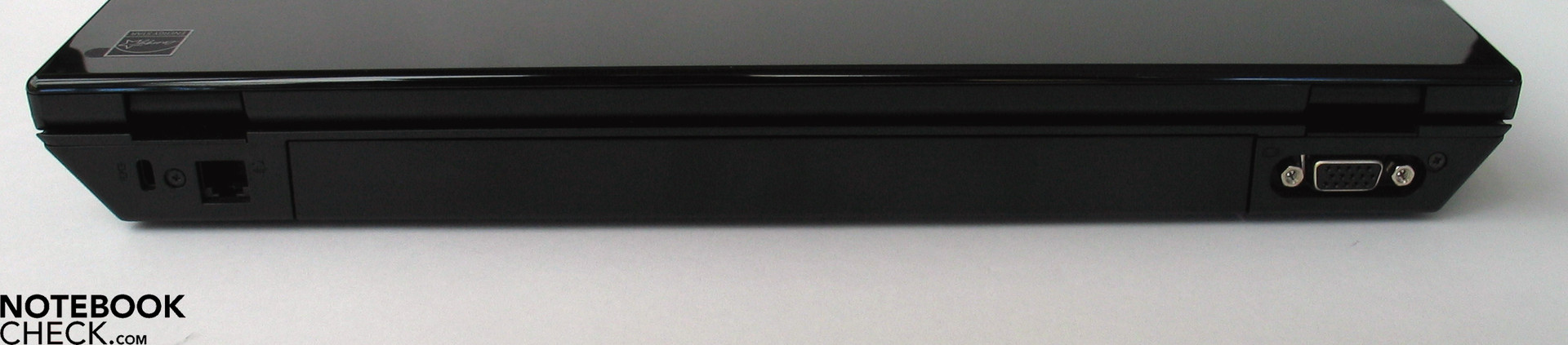 Die Rückseite wird wiederum zum Großteil durch den zentral liegenden Akku in Anspruch genommen. Links davon liegen der Kensington Lock sowie der Modem Anschluss, rechts davon der analoge VGA Port zum Anschluss eines externen Monitors oder Beamers.