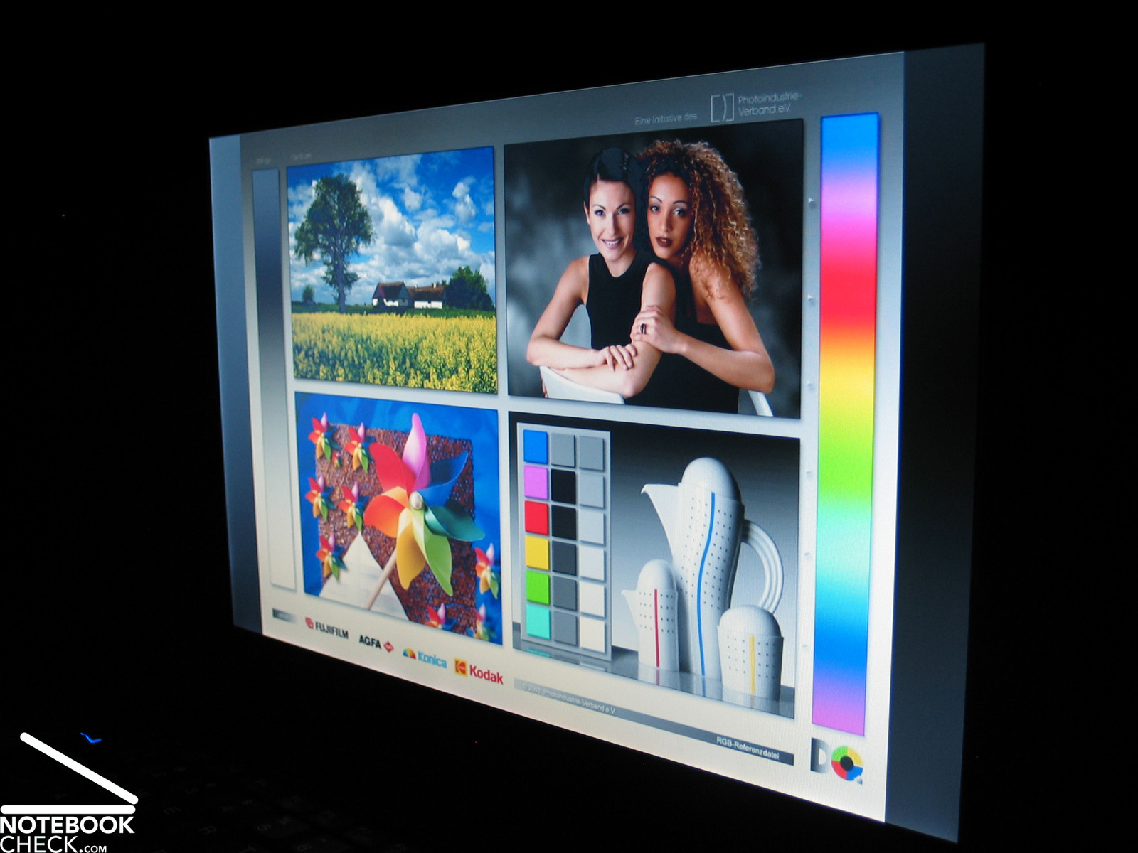 Das Display mit spiegelnder Displayoberfläche zeigt subjektiv kräftige Farben und ein scharfes Bild. Die Messung zeigt jedoch einen überaus hohen Schwarzwert von 1.77 cd/m², welcher in Verbindung mit der maximalen Helligkeit von 269 cd/m² lediglich ein maximales Kontrastverhältnis von 152:1 bedeutet.