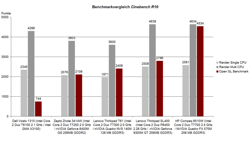 Ähnlich gut positioniert sich das Thinkpad im Cinebench R10 Vergleichstest. Die eingesetzte P8400 CPU erreicht im Rendering Test das Niveau einer T7700 Merom CPU mit 2.4 GHz. Hier ist der Leistungsvorteil der neuen Intel CPUs in 45 Nanometer Technik gut erkennbar. Im Cinebench Shading Test erreicht das Thinkpad SL400 mit Geforce 9300M GS Grafik ebenso ein passables Ergebnis und setzt sich deutlich vor die Geforce 8400M GS bzw. die Quadro NVS 140M, der Anwenderoptimierten Version der Geforce 8400.