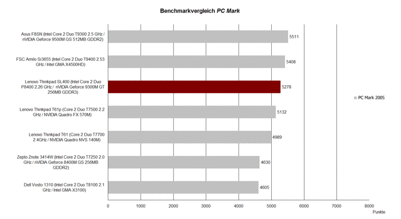 Wenig überraschend schneidet das SL400 im PCMark 2005 Benchmarktest mit erreichten 5278 Punkten überaus souverän ab. Hier kann sich die neue Einsteigerklasse von Lenovo sogar vor das einstige Top-Modell, das T61p, ausgestattet mit T7500 CPU und Quadro FX570M Grafik setzen.