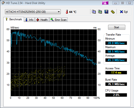 Als Massenspeicher war eine 250GB Festplatte von Hitachi verbaut (HTS542525K9S), die im HDTune Benchmarktest überaus gute Übertragungsraten sowie mit 17.4 Millisekunden auch eine flotte Zugriffszeit bietet. Es ist anzunehmen, dass speziell im Bereich Arbeitsspeicher und Massenspeicher zahlreiche verschiedene Ausstattungsvarianten angeboten werden.