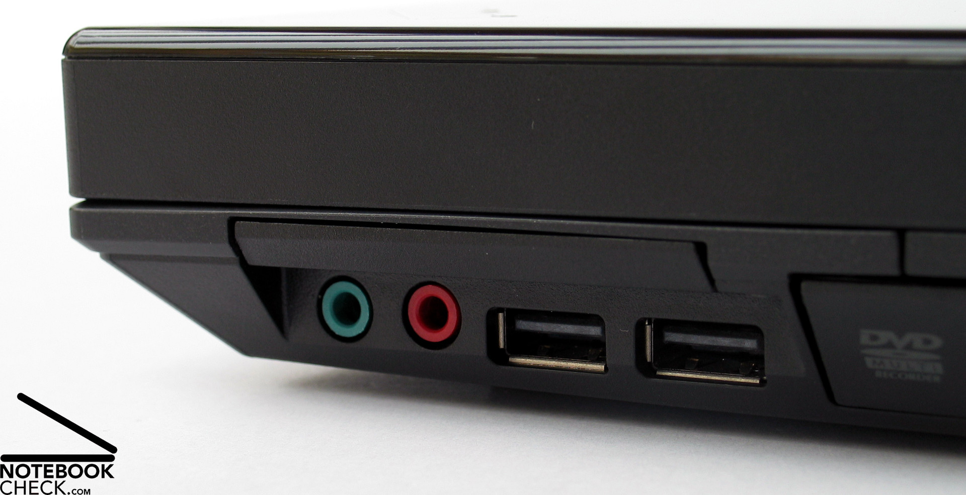 Die rechte Gehäuseseite nimmt im vorderen Bereich die Audio Ports (Kopfhörer und Mikrofon) sowie zwei USB 2.0 Ports auf. Direkt darüber wurde der ExpressCard Slot positioniert. Im Anschluss folgt das optische Laufwerk. Je nach Ausstattungsvariante kann hier auch ein Blu-Ray Laufwerk eingesetzt werden. Im hinteren Bereich der rechten Seitenkante findet man noch den Modem- und den LAN Anschluss.