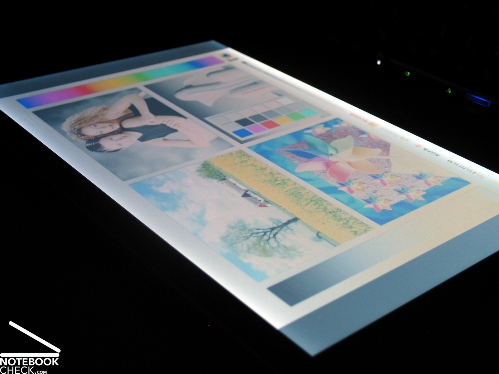 Beim Display sind die durchaus gute Helligkeit als auch die gute Ausleuchtung mit knapp 90% als positiv anzuführen. Nicht optimal fallen die gebotenen Blickwinkel aus. Speziell im vertikalen Bereich kommt es rasch zu Bildveränderungen die im mobilen Betrieb des Notebooks ein häufiges Anpassen des Displayneigungswinkels bedingen.