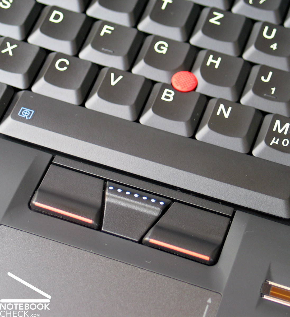 Der Trackpoint ist zwar für Quereinsteiger anfangs höchst gewöhnungsbedürftig, langfristig gesehen aber doch der bessere Mausersatz. Durch einen leichten Druck auf den roten Gummiknopf wird der Mauszeiger in die gewünschte Richtung bewegt, ohne dabei den Zeigefinger auch nur einen Millimeter bewegen zu müssen. Mit dem Daumen kann man nun gleichzeitig mit ein und derselben Hand die drei zugehörigen Tasten bedienen. Ein Nachsetzen bei längeren Distanzen wie etwa beim Touchpad oft notwendig bleibt somit aus. Auch wenn man an den Bedienungskomfort und Schnelligkeit einer externen Maus nicht herankommt, im mobilen Einsatz ist der Trackpoint die erste Wahl.