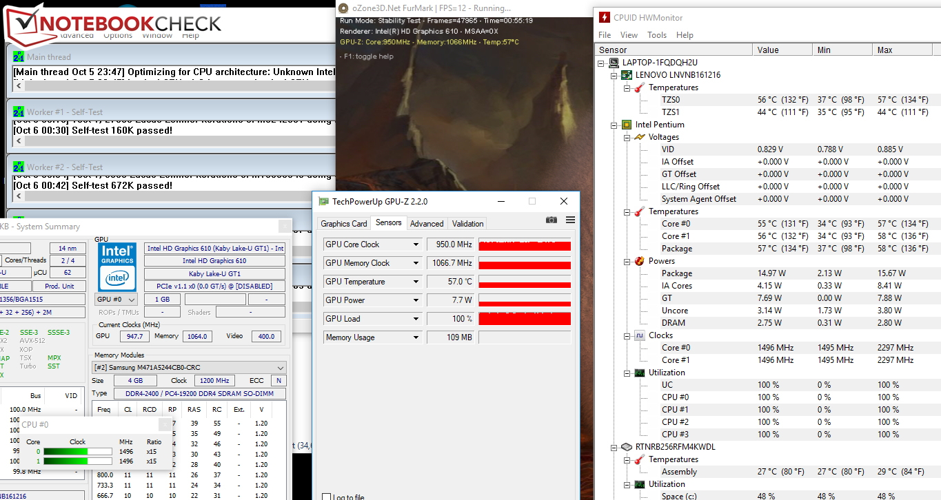 Unseren Stresstest (Prime95 und FurMark laufen für mindestens eine Stunde) durchläuft das V110-15IKB im Netz- und Akkubetrieb auf die gleichen Weisen. Der Prozessor wird nach wenigen Minuten auf 1,5 GHz abgebremst und verbleibt auf diesem Niveau. Der Grafikkern arbeitet mit 900 bis 950 MHz.