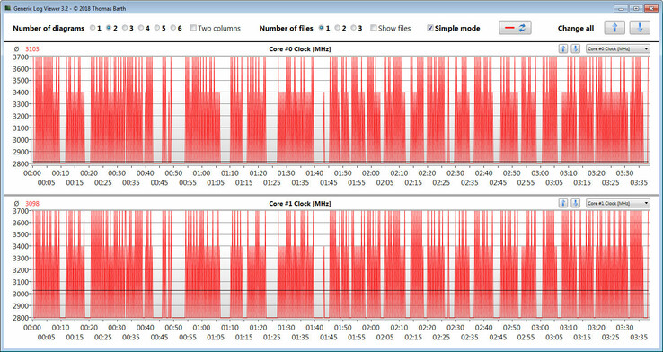 Die Multi-Thread-Tests der Cinebench-Benchmarks bearbeitet der Prozessor mit 3,4 bis 3,7 GHz. Allerdings wird er immer wieder mal auf 2,8 GHz abgebremst. Die Single-Thread-Tests werden mit 3,7 GHz durchlaufen. Das Verhalten fällt im Netz- und im Akkubetrieb identisch aus.