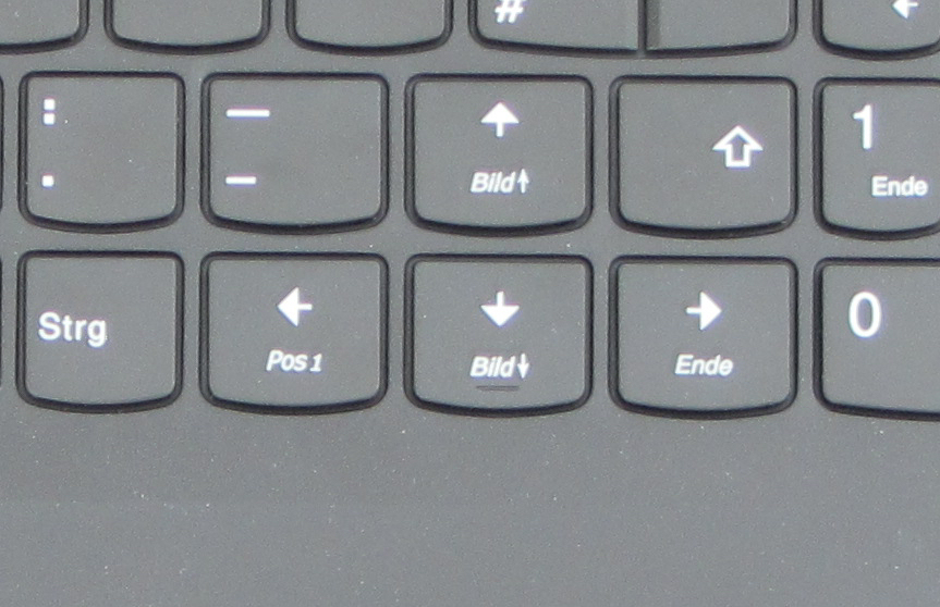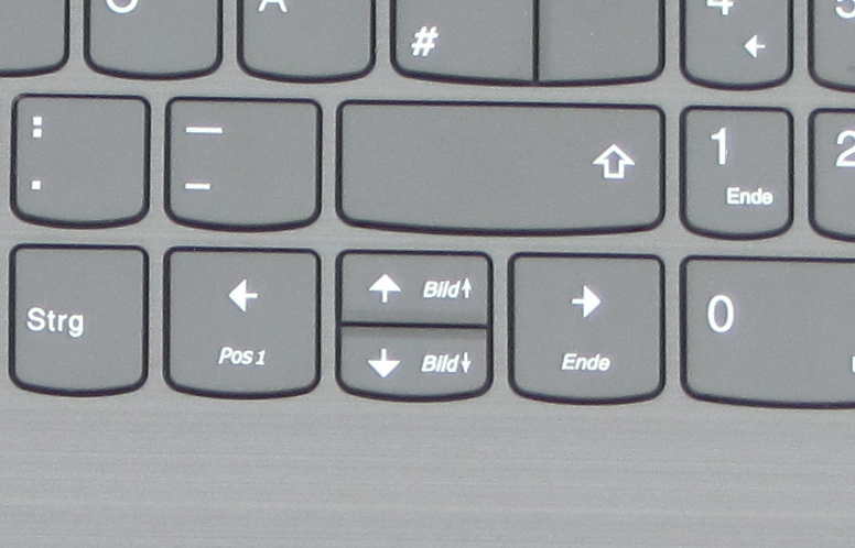 Die Tastaturen der diversen Lenovo-Notebookserien der Vorgängergeneration weisen einen lästigen Layout-Fehler auf: Hier befindet sich die Pfeil-nach-oben-Taste an der Position, die ansonsten der rechten Shift-Taste vorbehalten ist. Letztere ist rechts daneben positioniert. Daher wird oftmals die Pfeil-Taste gedrückt, obwohl die Shift-Taste gemeint ist. Dies hat Lenovo bei der Tastatur unseres Testgeräts korrigiert.