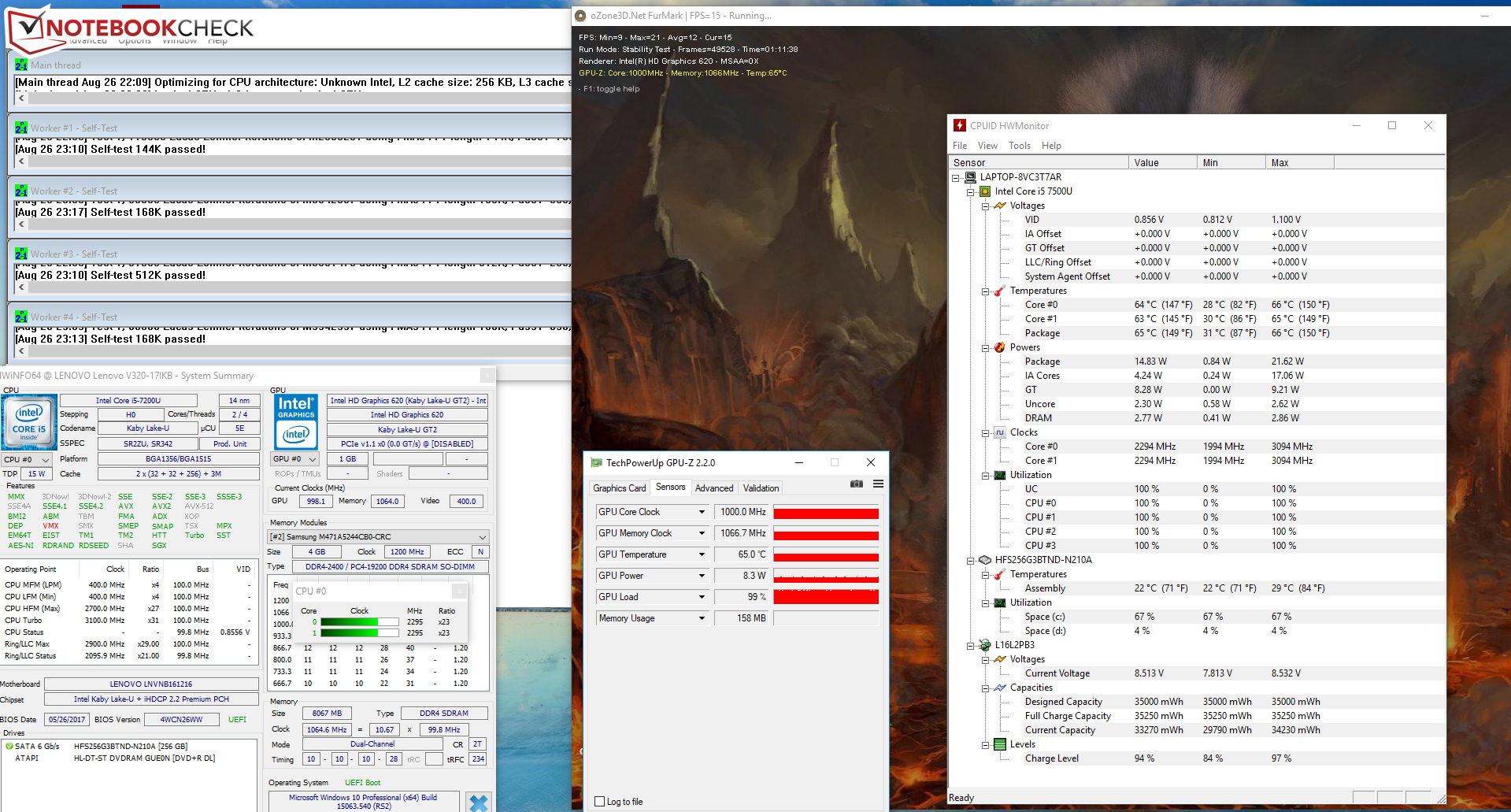 Unseren Stresstest (Prime95 und Furmark laufen für mindestens eine Stunde) durchläuft das V320-17IKB im Netz- und im Akkubetrieb auf die gleichen Weisen. Der Prozessor arbeitet überwiegend mit 2,2 bis 2,5 GHz. Der Grafikkern werkelt durchgehend mit Maximalgeschwindigkeit (1.000 Hz). Sonderlich stark erwärmt sich der Rechner nicht. Während des Stresstests liegen die Temperaturen an allen Messpunkten deutlich unterhalb von 40 Grad Celsius.