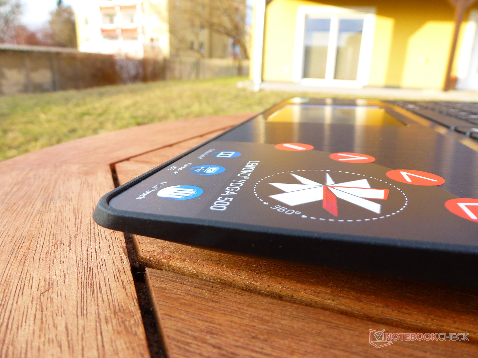 Der Außeneinsatz mit dem Lenovo Yoga 500-14ISK ist nur bedingt möglich. Bei zu starker Sonneneinstrahlung ist auf der spiegelnden Touch-Oberfläche fast nichts mehr zu sehen. Um noch halbwegs etwas erkennen zu können, müssen sich Nutzer einen Schattenplatz suchen. Aber auch da sind die starken Spiegelungen störend.
