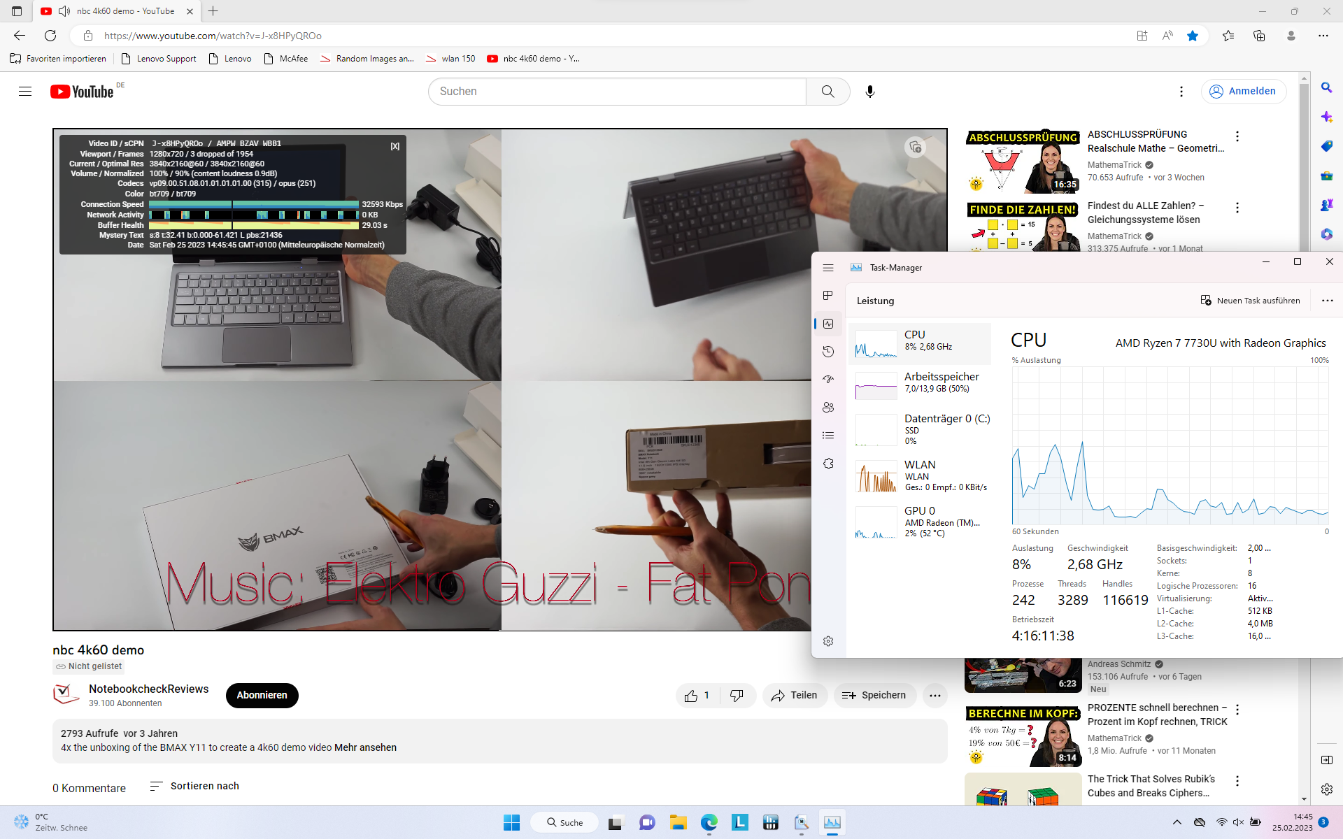 Fast 4 min lang kann das Yoga 6 seine volle Leistung abrufen und Prozessor sowie die integrierte Grafikeinheit mit den voreingestellten 25 W versorgen. Ist die erlaubte Spitzentemperatur erreicht, sinken Taktrate und Stromzufuhr, damit das System weiterhin arbeiten kann.