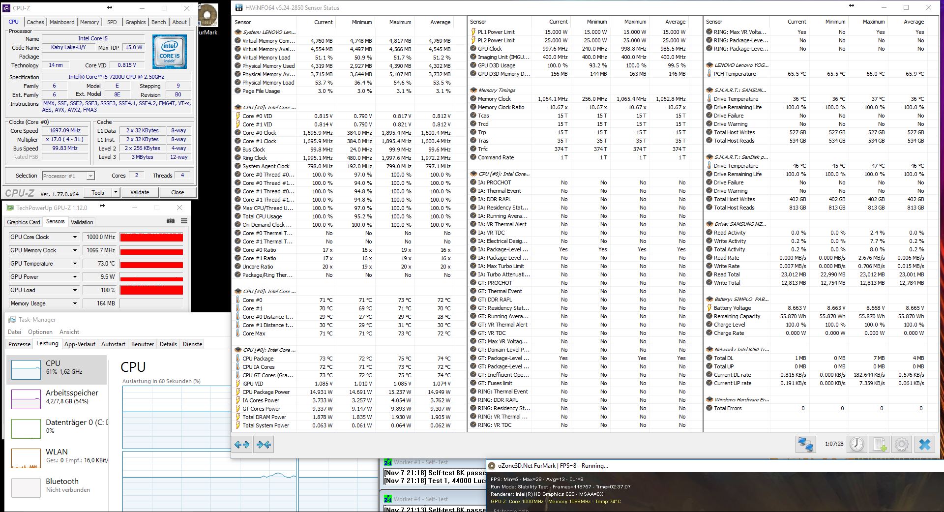 Der Intel Core i5-7200U löst den Intel Core i5-6200U ab. Beim Cinebench R15 verzeichnen wir beim Yoga 710-14IKB ein Leistungsplus von 11 Prozent in Multithread-Anwendungen. Die Single-Core-Performance konnte um 3 Prozent gesteigert werden. Die fest verlötete Kaby-Lake-CPU hat zwei physikalische Kerne, und mit Hilfe der Hyperthreading-Technologie kann dieser 4 Threads gleichzeitig verarbeiten. Der sparsame ULV-Prozessor besitzt wie der Vorgänger weiterhin eine TDP von nur 15 Watt. Der Arbeitstakt wurde um 200 MHz auf jetzt 2,5 GHz angehoben. Die Turbofunktion erlaubt eine Takterhöhung auf 3,1 GHz.
