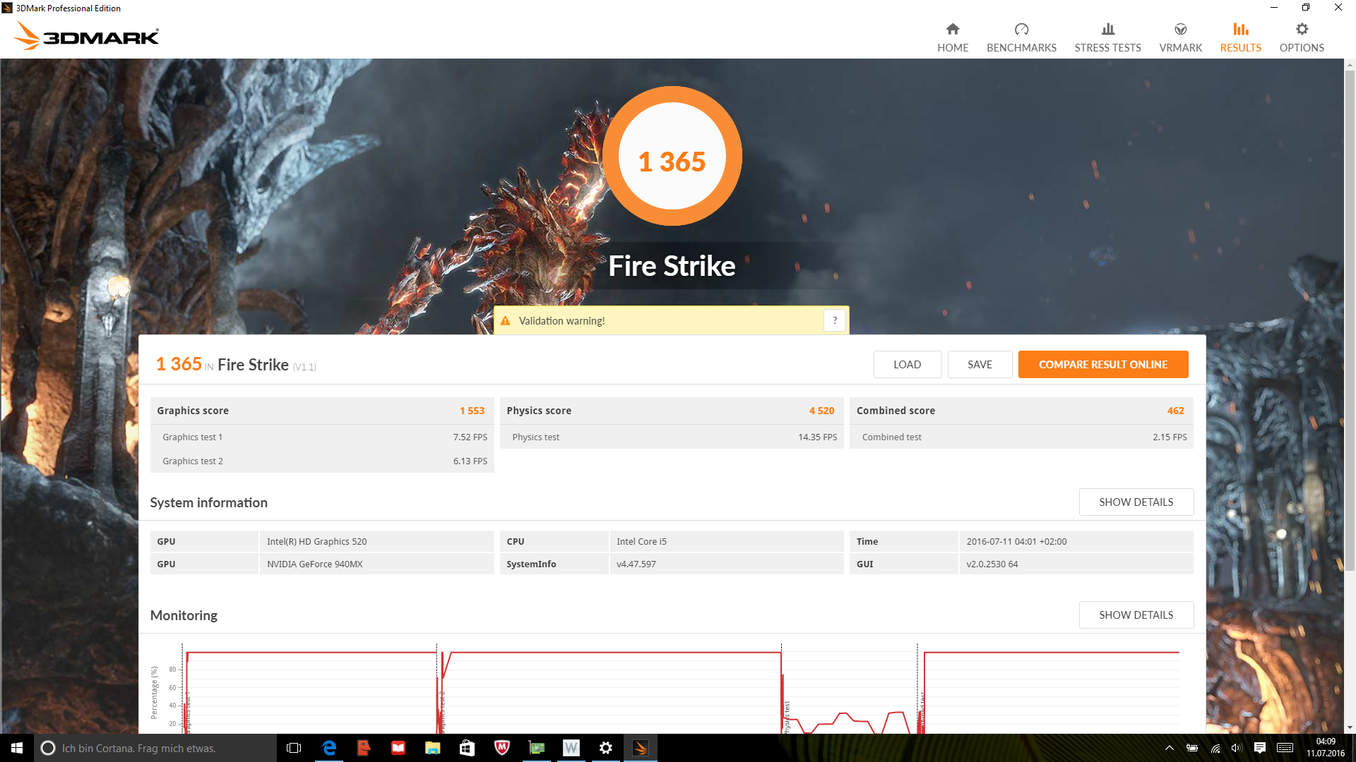 Die Gehäusetemperatur unseres Testgerätes liegt im Leerlauf mit durchschnittlich 27 °C deutlich unter der 30-°C-Marke. Bei Volllast steigen diese Werte und erreichen maximal 43,4 °C. Dieser Hotspot befindet sich oberseitig, mittig und oberhalb der Tastatur. Bei diesem Stresstest, welches ein Extremszenario darstellt und im Alltag kaum auftritt, arbeiten die Programme Prime95 und Furmark für mindestens eine Stunde parallel. Dabei erwärmte sich die CPU auf maximal 82 °C, und bei der GPU ermittelten wir eine Temperatur von 74°C. Der Prozessor arbeitet kontinuierlich mit 2,3 GHz. Bei der Nvidia GeForce 940MX schwankte der Takt leicht zwischen 980 MHz und 1.050 MHz. Thermales Throttling haben wir bei diesem Belastungstest nicht feststellen können. Im direkten Anschluss an den Stresstest haben wir den Benchmark 3DMark 11 erneut laufen lassen. Das Ergebnis deckte sich mit dem, welcher im Kaltstart ermittelt wurde. Somit gibt es keinen Leistungsverlust, auch wenn das System längere Zeit unter Volllast betrieben wird.