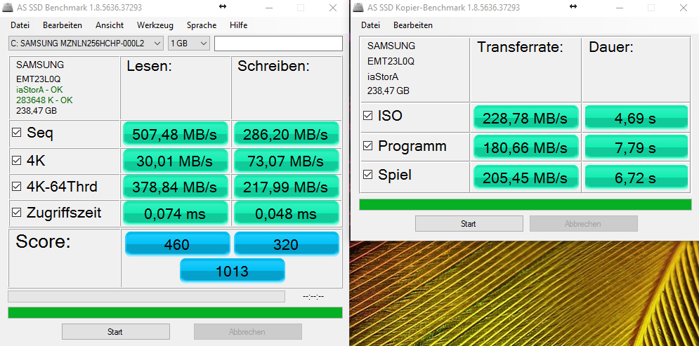 Der seitlich verbaute Kartenleser verarbeitet alle gängigen Formate (MMC, SD, SDHC, SDXC). Die Leistung überprüfen wir mit unserer Referenzspeicherkarte (Toshiba Exceria Pro SDXC 64 GB UHS-II). Bei diesem Test werden 250 identische jpg-Dateien von der Speicherkarte auf den Systemdatenträger kopiert. Dabei erreicht das Yoga 710 eine durchschnittliche Transferrate von 77,8 MB/s. Damit setzt sich unser Testgerät an die Spitze und verweist das Lenovo Yoga 510 und das HP Envy 15 auf die Plätze. Beim sequenziellen Lesen, welches wir mit dem Programm AS SSD ermitteln, liegen alle Kontrahenten gleichauf. Wir notieren beim Yoga 710 einen Wert von 87,1 MB/s. Insgesamt betrachtet ist die Leistung des Kartenlesers als durchschnittlich zu bewerten.