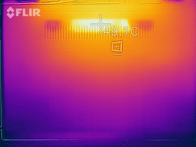 Die Außentemperaturen im Idle-Zustand sind kaum der Rede wert – unter Last steigen die Temperaturen dagegen vor allem im hinteren Bereich des Gehäuses etwa an. Maximal messen wir an der Unterseite mittig 46,2 °C – fühlbar warm, insgesamt aber noch im grünen Bereich.