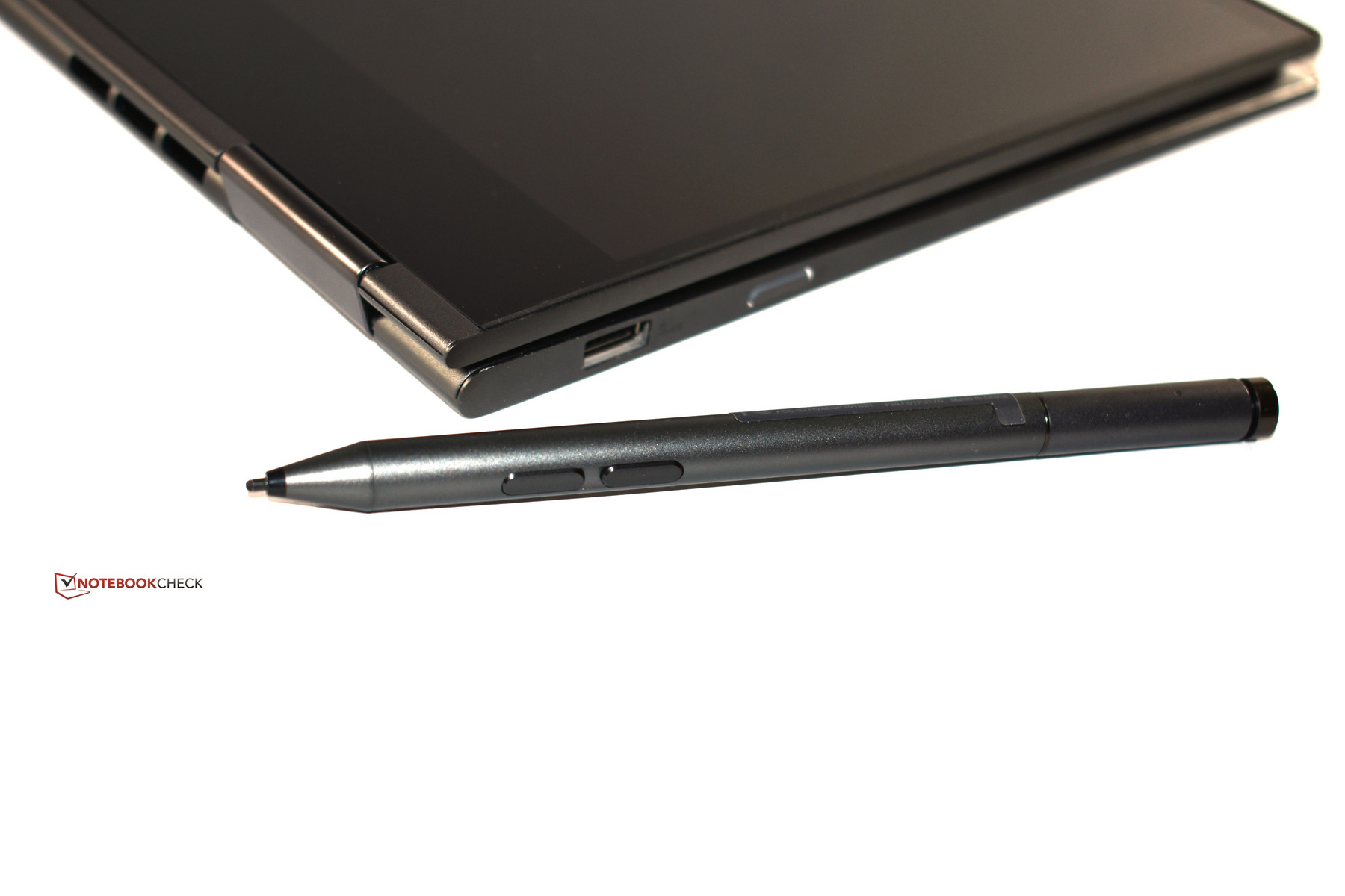 Anstelle des Touchpads kann man auch entweder auf den Touchscreen oder den beiliegenden Digitizer-Pen zurückgreifen. Der Touchscreen erkennt zehn Finger gleichzeitig und erkennt alle Eingaben präzise. Der Stift basiert auf Wacoms AES-Technologie und verfügt über 4.096 Druckstufen. In unserem kurzen Test funktionierte er auch am Rand des Displays einwandfrei. Der Pen lässt sich angenehm in der Hand halten und er hat zwei Tasten, deren Funktionen sich über eine vorinstallierte Lenovo-App definieren lassen. Standardmäßig ist eine Taste mit der Radierfunktion belegt.
