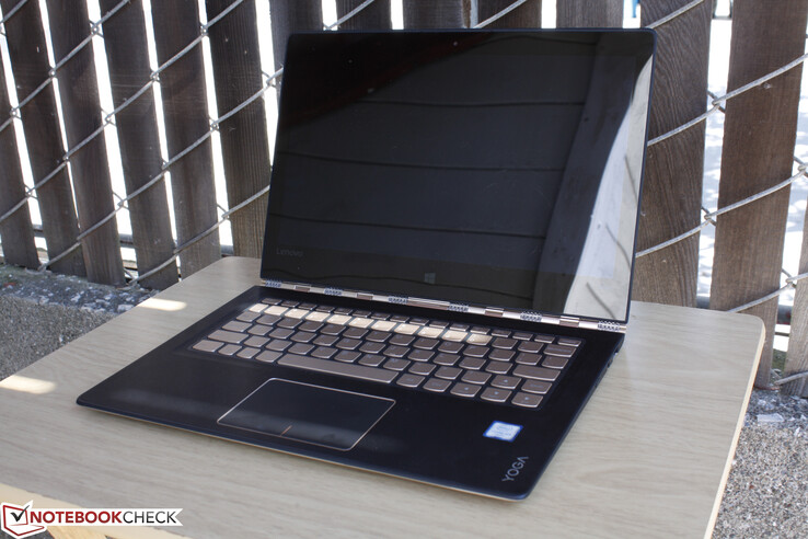 Während die Baureihen Yoga 700 und 500 eher Mittelklassemodelle darstellen, handelt es sich bei der Yoga-900-Serie um die Flagship-Modelle des Herstellers. Dementsprechend hochwertig ist auch das Design unseres Testgerätes, welches die glatten, abgerundeten und matten Oberflächen, das Kohlefasergehäuse und die gummierten Bereiche (Handballenauflage, Ecken und Kanten) vom Yoga 900 übernimmt. Auch das Watchband-Gelenk, welches den hochwertigen Yogas vorbehalten ist, finden wir hier vor. Eine Aussparung an der Vorderseite gibt es leider nicht, weshalb der Deckel selbst mit beiden Händen etwas fummelig zu öffnen ist. Insgesamt hat Lenovo aber trotz dem kompakteren Gehäuse und der geringeren Leistung glücklicherweise nicht bei der Qualität gespart. Das Yoga 900 ist vielleicht nur so groß wie ein Netbook, fühlt sich aber deutlich hochwertiger an.