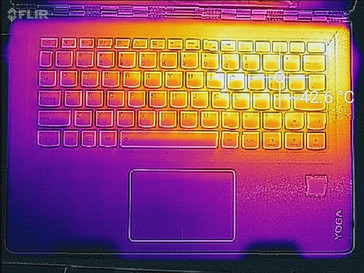 Ohne Lüfter, der die warme Luft aus dem Gehäuse transportiert, staut sich die Hitze des 900S praktisch an einem Punkt. Lenovo hat den Prozessor soweit wie möglich in die hintere rechte Ecke geschoben, um Beeinträchtigungen beim Tippen zu vermeiden. Dadurch wird die rechte Seite aber auch deutlich wärmer als die linke, doch der Anstieg ist auch beim Wechsel zwischen den verschiedenen Betriebsarten niemals unangenehm. Oben rechts konnten wir maximal 42 °C messen, allerdings nur bei unrealistisch hoher Auslastung.