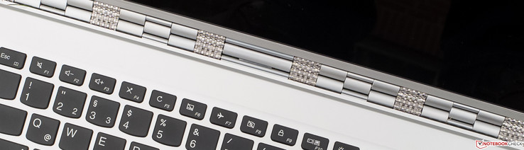 Das komplett in mattem Silber gehaltene, eigentlich sehr schlichte und kaum für Fingerabdrücke anfällige Alugehäuse fällt vor allem durch seine flache, vermeintlich keilförmige Bauform, den bis auf unten sehr schmalen Display-Bezel sowie die kettengliedartigen Scharnierelemente auf, die etwas an metallische Uhrenarmbänder erinnern und durchaus extravagant wirken. Auf der Rückseite prangt das erhabene Lenovo-Logo, die umlaufenden Kanten sind nicht gerade, sondern mit einem Profil versehen, was für eine gewisse Scharfkantigkeit sorgt und längeres Halten in der Hand unkomfortabel machen kann. Im Tablet-Modus kann es aufgrund des schmalen Bezels passieren, dass man mit den Fingern unbeabsichtigte Aktionen auslöst.