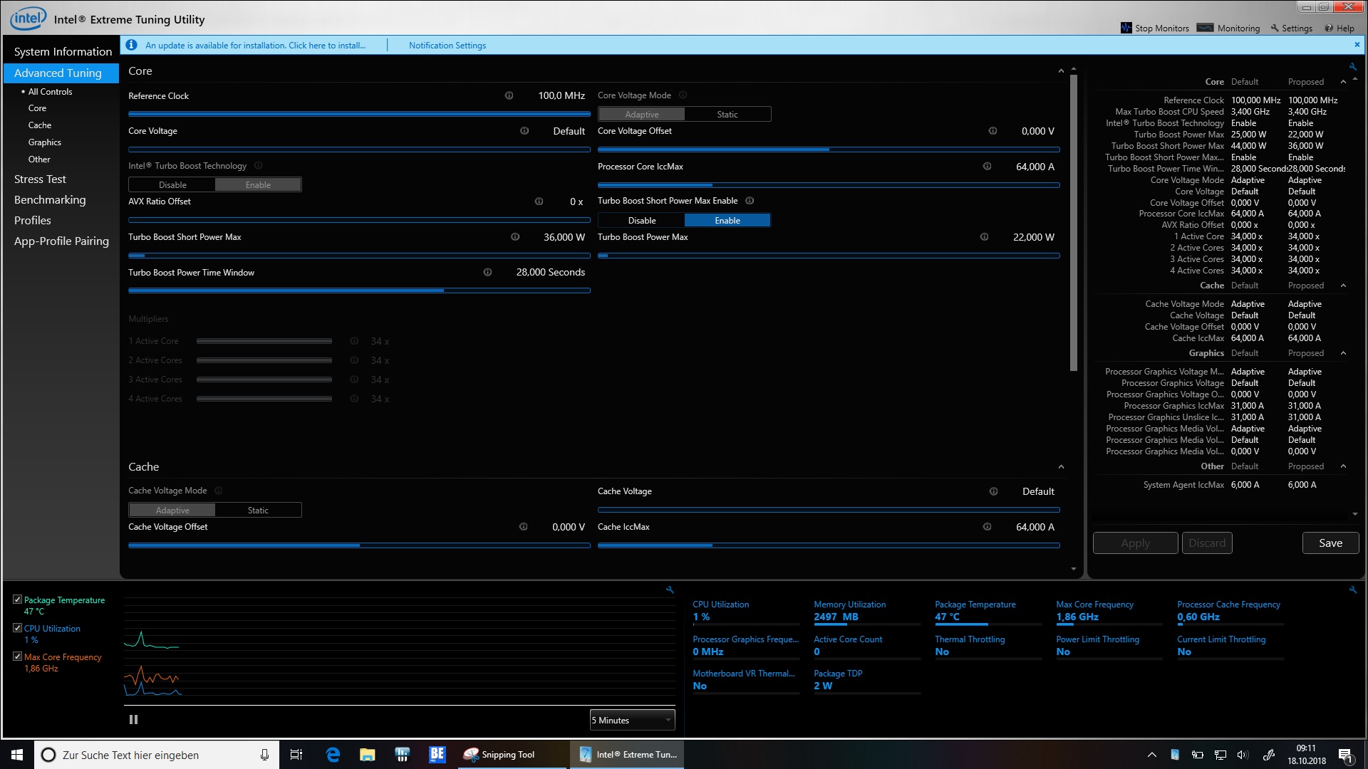 Bei gleichzeitiger Belastung von CPU und integrierter Grafikeinheit zeigt sich ein ähnliches Bild. Aufgrund der gemeinsamen TDP erreicht der Prozessor jedoch nur noch eine Arbeitsgeschwindigkeit von 800 MHz. Die Intel UHD Graphics 620 kommt auf eine durchschnittliche Taktfrequenz von 634 MHz.