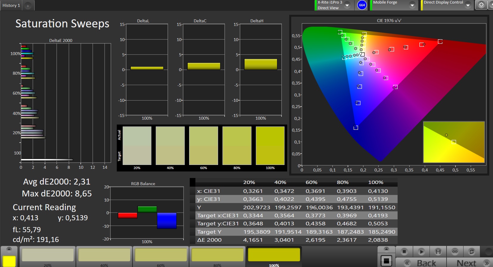 Im Testlabor lassen wir die Software CalMAN laufen und untersuchen die Bilddarstellung mit dem Spektralfotometer. Dabei ergeben sich sowohl in den Werkseinstellung wie auch im vordefinierten zweiten Farbmodus "hell" etwas höhere Farbabweichungen als bei anderen High-End-Tablets, vor allem die Weißdarstellung wirkt grünstichig.