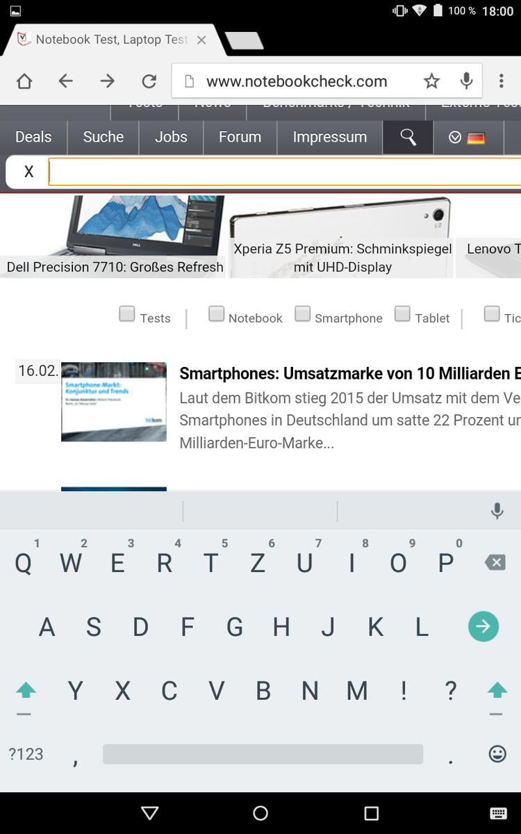 Obwohl im Yoga Tab 3 10 nur ein Einsteiger-SoC steckt, reagiert der 10-Zöller im Test sehr flott auf Eingaben, egal ob sie über die physischen Tasten am Gerät oder über den kapazitiven Touchscreen erfolgen. Trotz der mageren RAM-Ausstattung von 1 GB gerät das Lenovo Tablet auch bei mehreren gleichzeitig geöffneten Apps nicht aus der Puste und wechselt schnell zwischen den einzelnen Programmen hin und her. Die virtuelle Tastatur legt durch ihre große Tasten auch Vielschreibern keine Hindernisse in den Weg. Im Querformat nimmt sie etwa die Hälfte des Bildschirms ein, hochkant nur etwa ein Drittel - Platz für eine zusätzliche Zahlenreihe wäre also durchaus noch vorhanden. Dennoch muss man stets per Tastendruck zwischen Ziffern- und Buchstaben-Layout hin- und herwechseln, wodurch sich manche Eingaben unnötig in die Länge ziehen.