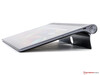 Dieser Klappständer des Tablets ermöglicht es, das Gerät in vier verschiedenen Varianten zu nutzen. Im eingeklappten Modus schließt er perfekt mit dem übrigen Gehäuse ab und liegt durch die Yoga typische Wulst angenehm in der Hand. Per Knopfdruck lässt sich die Arretierung des Ständers lösen. Dann lässt es sich im Tilt-Modus ideal für den Beamer-Einsatz aufstellen. Im Stand-Modus kann das Gerät komplett aufgerichtet werden. Alternativ lässt sich das Tablet sogar aufhängen.