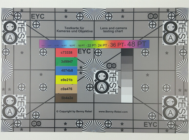 Auf dem Testchart ist die Schärfe selbst in der Bildmitte nicht gut, Abbildungsfehler gibt es jedoch keine. Zum Rand hin bleicht die Darstellung etwas aus, die Schärfe verschlechtert sich aber nicht weiter.