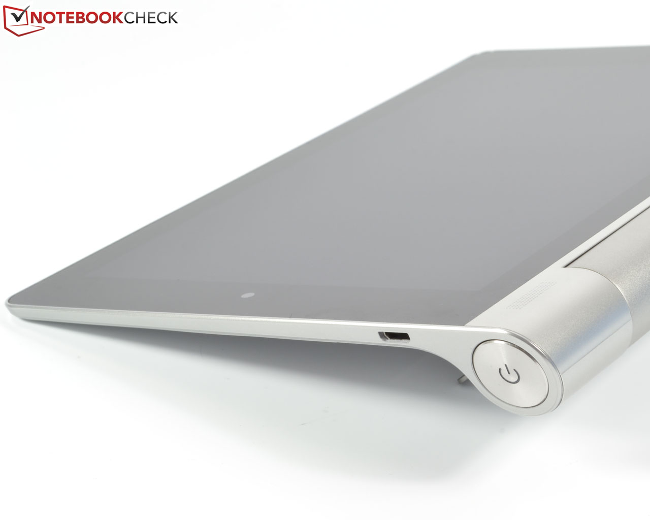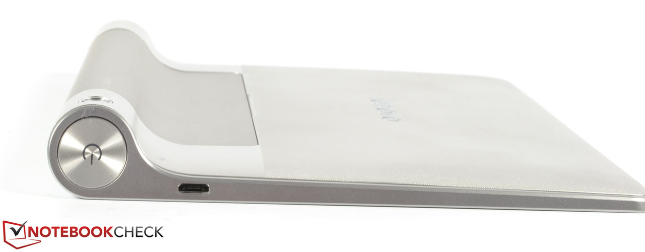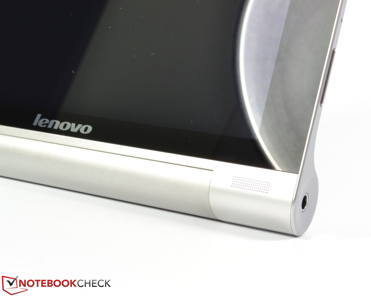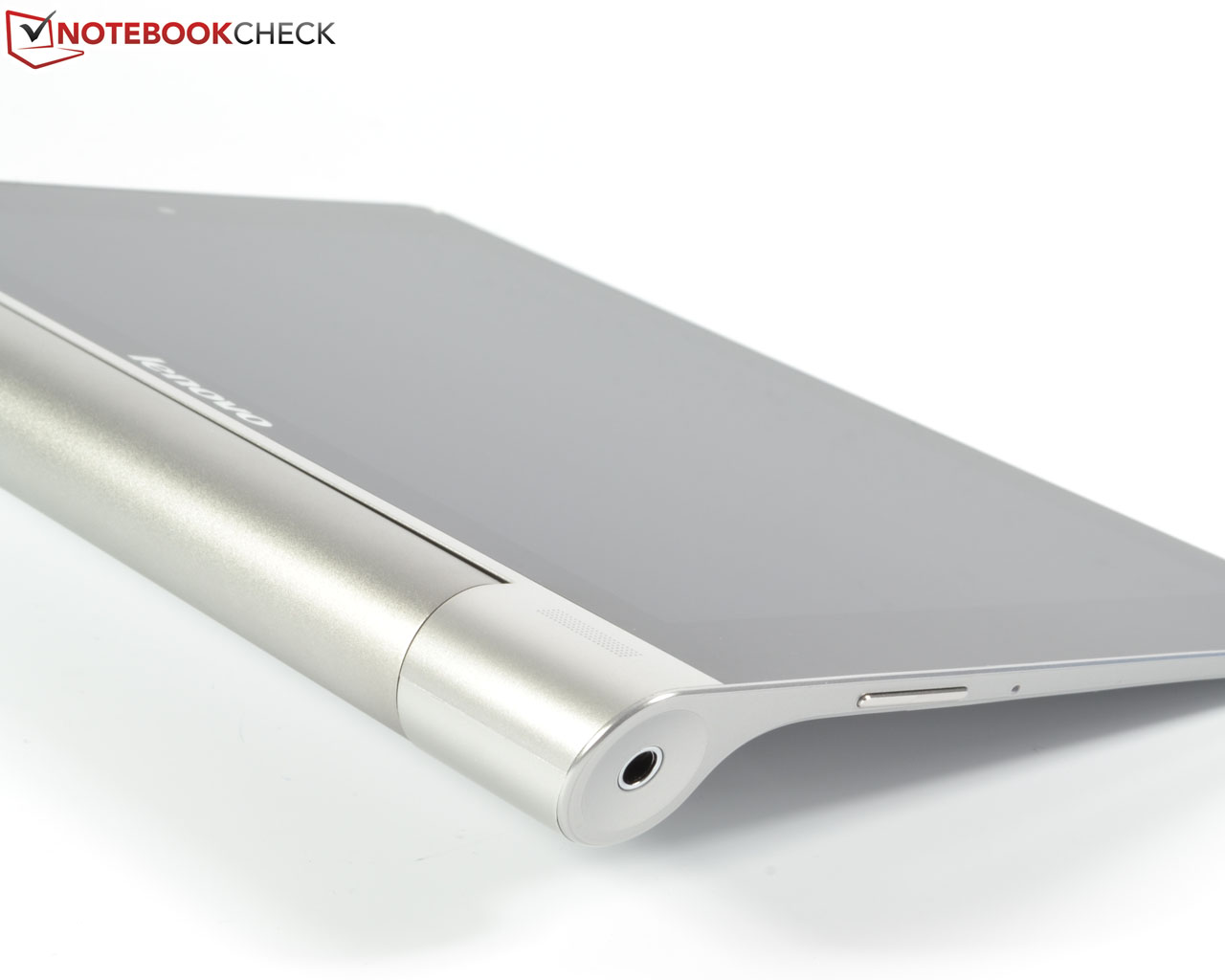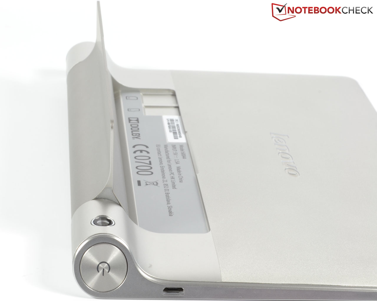 Das Gehäuse des Lenovo Yoga Tablet 8 unterscheidet sich von den meisten Konkurrenten durch sein extravagantes Design. In dem zylindrischen Teil mit 21 mm Durchmesser stecken neben dem Akku ein Klappständer. Dadurch konnte der Rest des Gehäuses sehr schlank gestaltet werden.