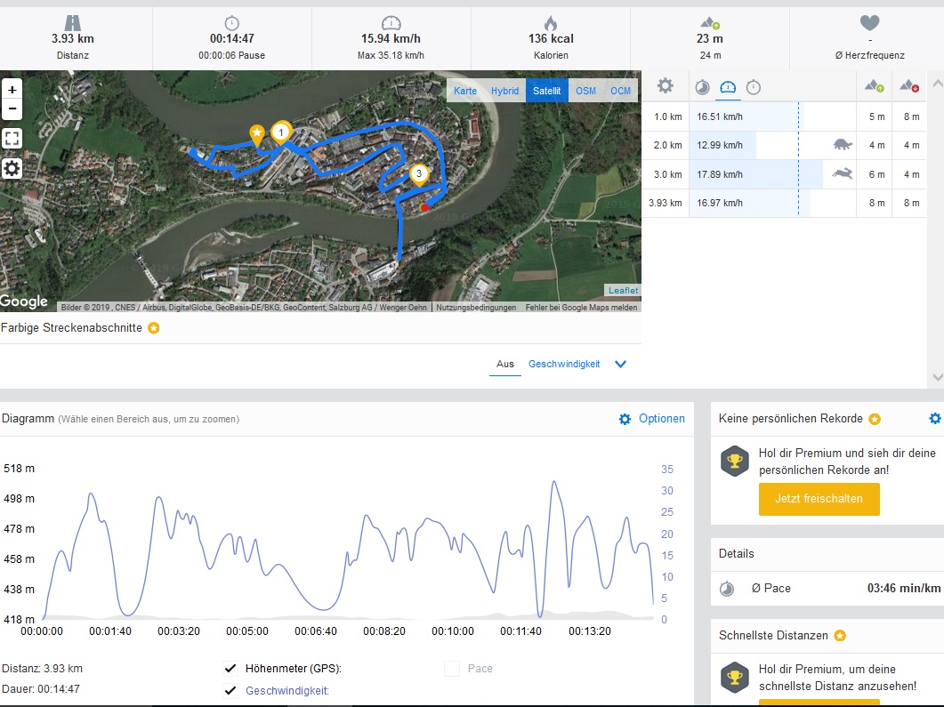 In unserem praxisnahen Test, bei dem die Wegdistanz mithilfe des GPS-Moduls des Mittelklasse-Smartphones und des GPS-Fahrradcomputers Garmin Edge 520 parallel aufgezeichnet wird, zeigt das Lenovo-Phone recht hohe Abweichungen im Streckenverlauf von 310 Metern - die Genauigkeit des Smartphone-GPS-Moduls ist insgesamt nur durchschnittlich. Diese Abweichungen sollten für alltägliche Navigationsaufgaben dennoch kein Problem darstellen.