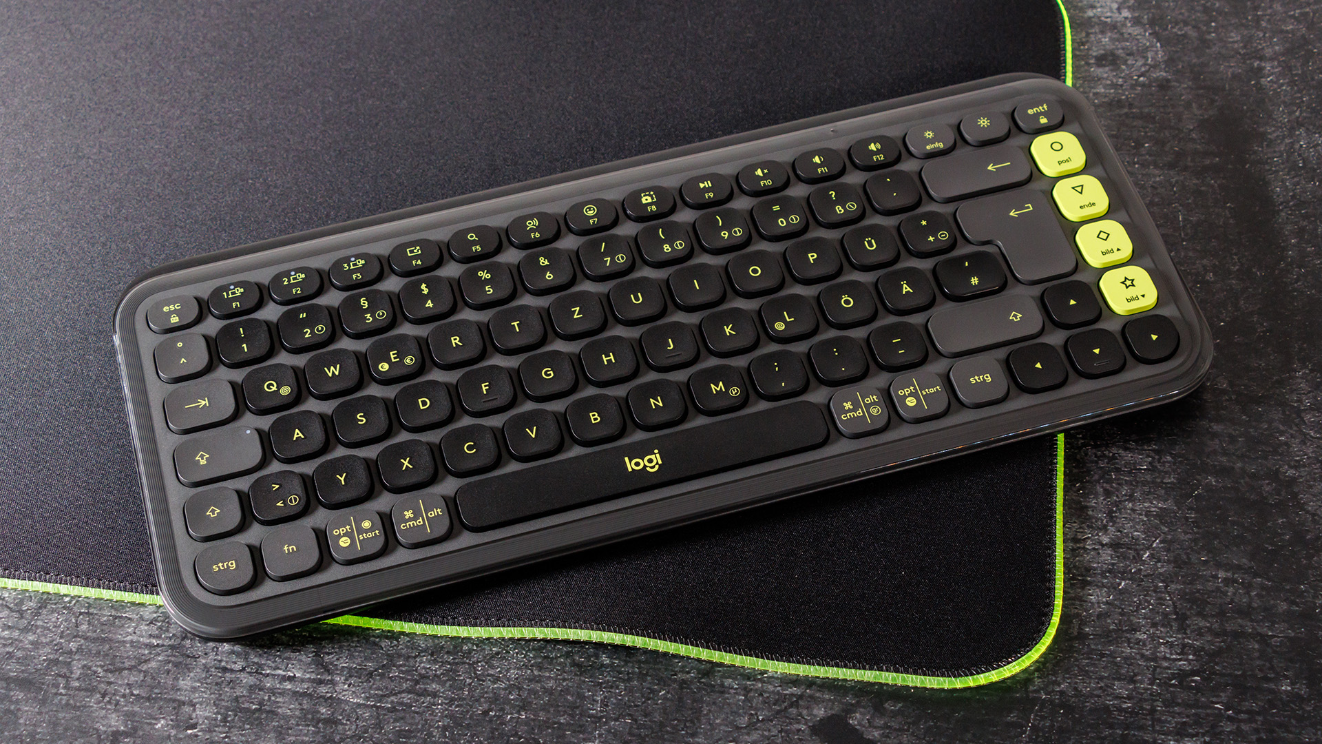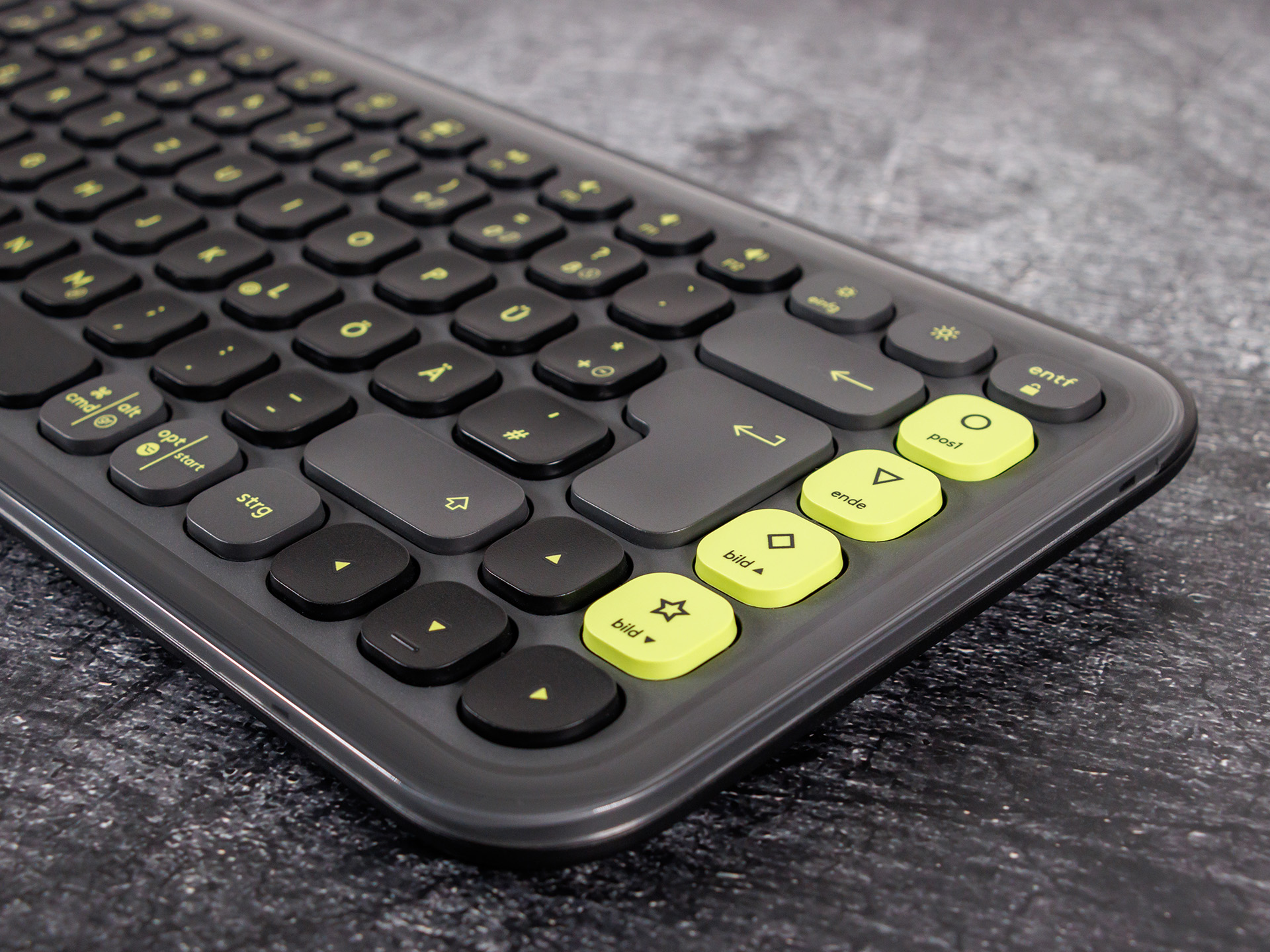 Die Logitech Pop Icon Keys nutzt ein sogenanntes 75-%-Layout und ist entsprechend schmal. Es kommen flache Rubberdome-Tasten zum Einsatz, die zum Großteil leicht nach innen gewölbt sind. Das Schreibgefühl mit der Tastatur gefällt uns gut, die Tasten besitzen klare Druckpunkte und benötigen einen etwas festeren Anschlag, dennoch bleiben diese angenehm leise.