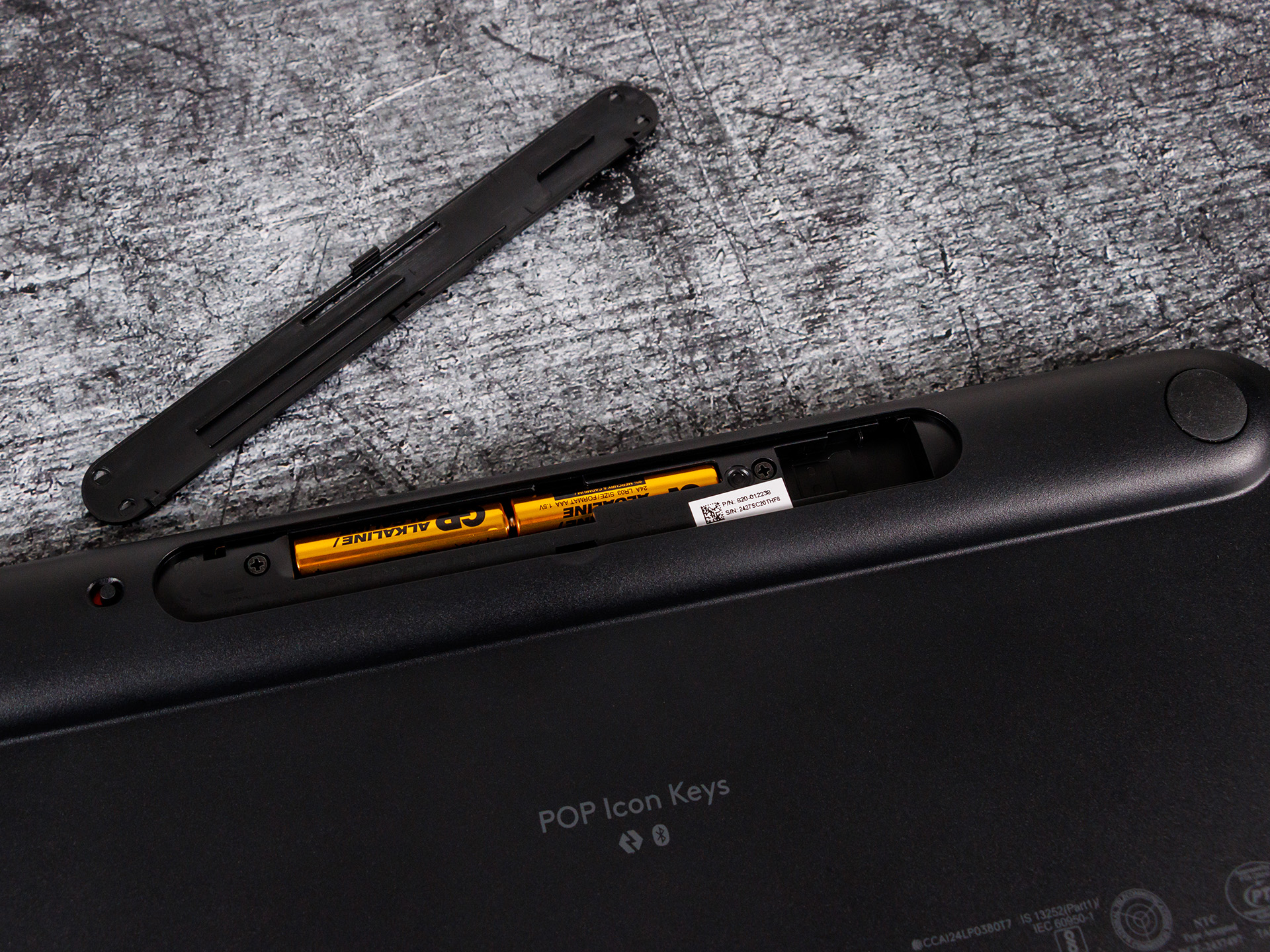 Auf der Unterseite gibt es fünf gummierte Standfüße, welche Anschläge dämpfen und einen sicheren Halt für die Tastatur gewährleisten. Dort ist auch eine Wartungsklappe zu finden, welche den Zugriff auf die beiden AAA-Batterien erlaubt. Außerdem ist dort auch eine Aussparung für den optionalen USB-Adapter Logi Bolt zu finden. Direkt neben der Klappe findet sich zudem noch ein Ein-/Ausschalter.