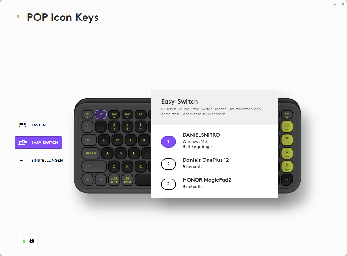 Wird Logi Bolt verwendet, ist dies automatisch auf der ersten Easy-Switch-Taste hinterlegt. Alternativ kann auch eine herkömmliche Bluetooth-Verbindung genutzt werden, womit sich dann auch alle gängigen Smartphones und Tablets verbinden lassen. Insgesamt kann die Pop Icon Keys mit bis zu drei Geräten gleichzeitig gekoppelt sein, über die Easy-Switch-Tasten kann dann einfach zwischen diesen gewechselt werden.