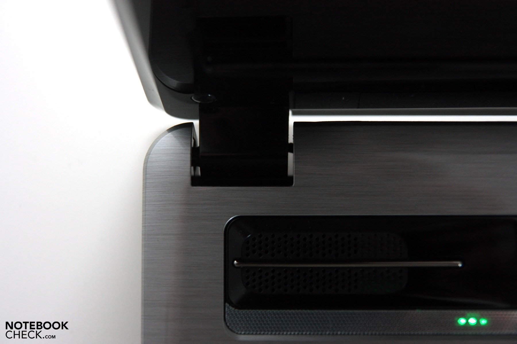 Die Stabilität des Deckels kann besser überzeugen. Verwindungen mit den Händen an den Ecken sind möglich, halten sich aber in Grenzen. Das Panel ist in den oberen zwei Dritteln der Rückseite gut geschützt. Nur im unteren Bereich der Deckelrückseite lassen sich bei punktuellem Druck schnell Farbverfälschungen provozieren. Der Kunststoffdeckel ist mit einem gebürsteten Alufinish-Lack versehen. Die glänzende Kunststoffoberfläche zieht Fettfinger an und ist für Kratzer empfindlich. Auch Handballenablage und die Umrahmung der Tastatur bestehen aus diesem Kunststoff.