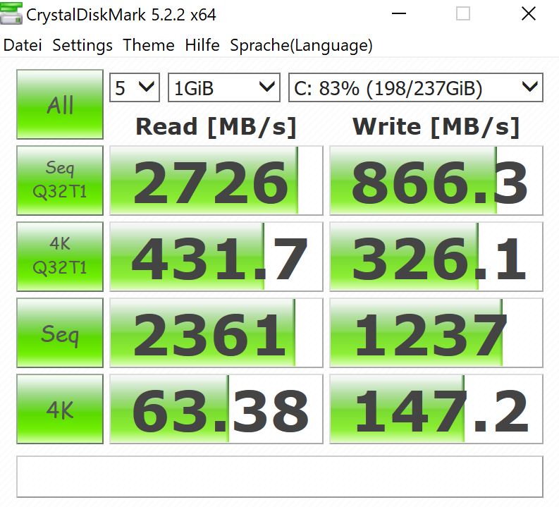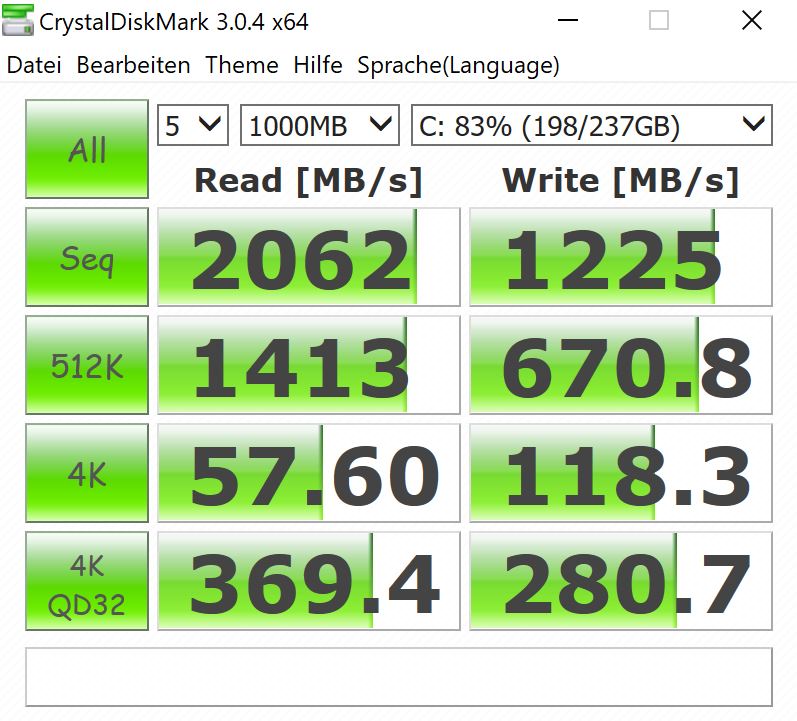 Da es sich hierbei um ein reines Gaming-Gerät handelt, ist viel Speicherplatz zwingend erforderlich. MSI stattet den Aegis 3 8RD mit zwei Massenspeichern aus. Für das Betriebssystem spendiert der Hersteller eine schnelle SSD von Intel mit 256 GB Speicherplatz. Sehr gut ist die schnelle NVMe-Anbindung, welche der langsameren SATA-Geschwindigkeit deutlich überlegen ist. Als zweiter Massenspeicher dient eine herkömmliche 3,5-Zoll-Festplatte von Western Digital. Diese bietet 1 TB Speicherplatz und wird durch eine Intel-Optane-SSD beschleunigt. Positiv beeinflusst diese Kombination die Leseraten, welche nun mit einer sehr schnellen SSD vergleichbar sind. Beim Schreiben hingegen ist man an die physikalischen Gegebenheiten der Festplatte gebunden. Mit einer durchschnittlichen Transferrate von 136 MB/s arbeitet dieser Datenträger aber nicht langsam.