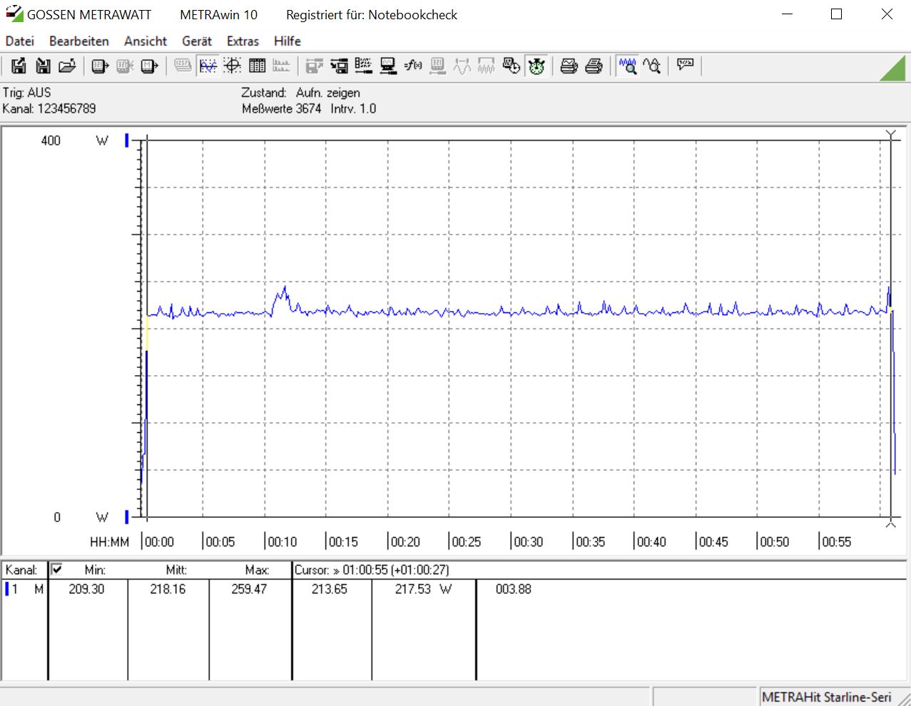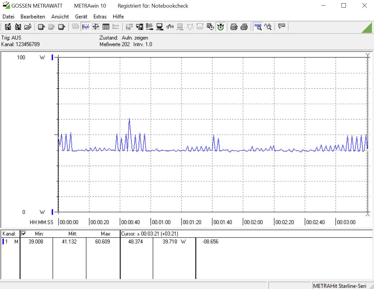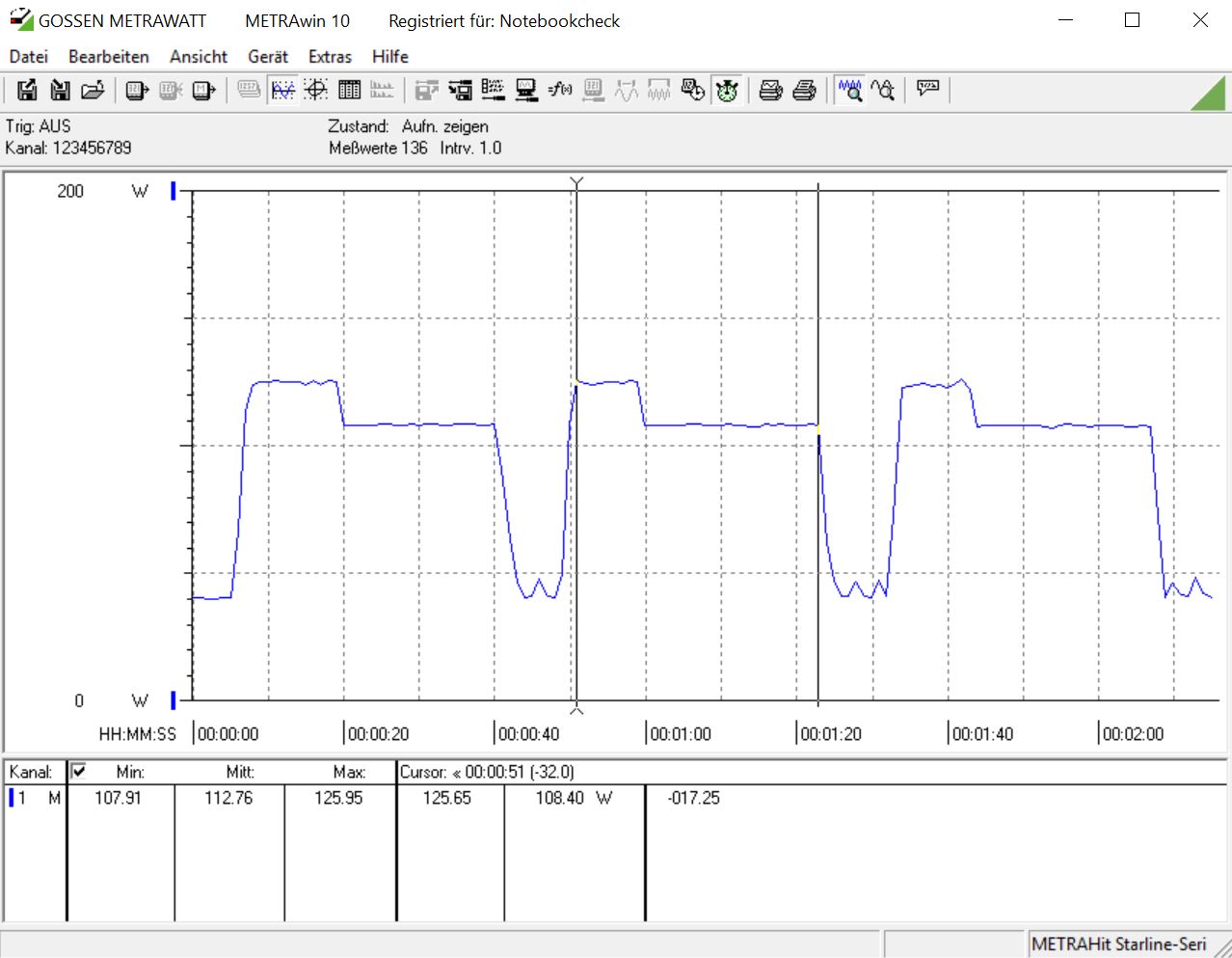 Im Leerlauf kommt der Rechner mit 41 Watt aus. Während des Cinebench R15 Multi Benchmarks ist sehr gut zu sehen, dass der Strombedarf der CPU nach acht Sekunden gedrosselt wird. Bei einem Durchlauf notieren wir einen durchschnittlichen Energiebedarf von 112 Watt, wenngleich zu Beginn der Verbrauch aufgrund des Turbo Boost Power Time Window